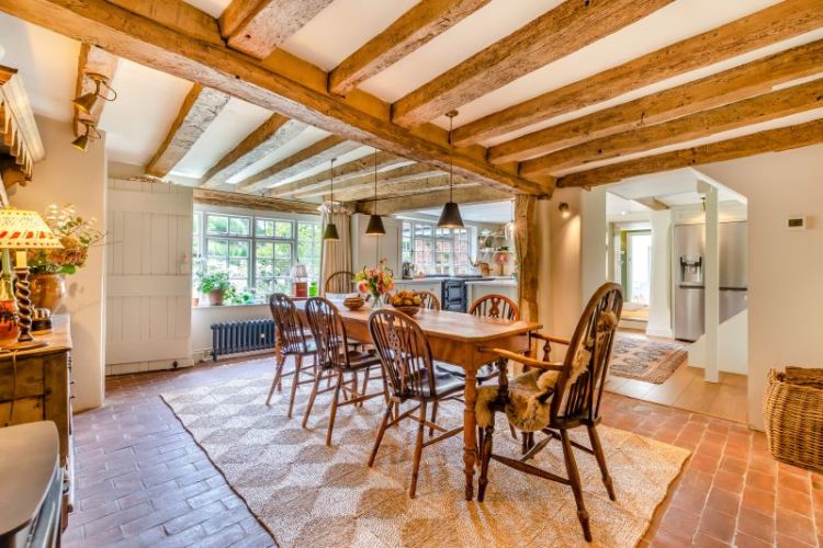 Set in almost four acres of grounds, Lane End Cottage certainly fulfils our country home aspirations. The Grade II Listed home blends cosy cottage interiors with contemporary touches. The sitting room, for example, is the oldest part of the house and brings together pops of colour with original features, such as the inglenook fireplace and exposed beams which have been taken back to their original pale oak colour to ensure a light and airy feel.