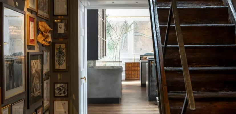 Adjoining the reception is a bright, sophisticated study which could also work as a second bedroom, complete with bespoke shelving, a second marble fireplace. A charming mezzanine level - ideal as a private library, tv snug, reading nook, or additional workspace - is tucked away up the origional period staircase.