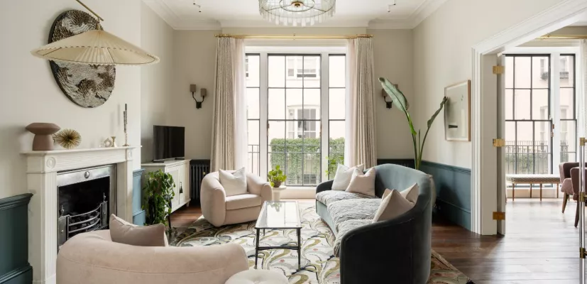 The double reception room is flooded with natural light from magnificent floor-to-ceiling sash windows, which open onto a private balcony overlooking the residents’ serene courtyard. A beautiful hand-carved fireplace forms the centrepiece of the sitting room, which flows effortlessly into the dining area, spacious enough to accommodate a large dining table, ideal for both intimate evenings and elegant entertaining.