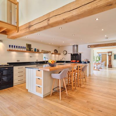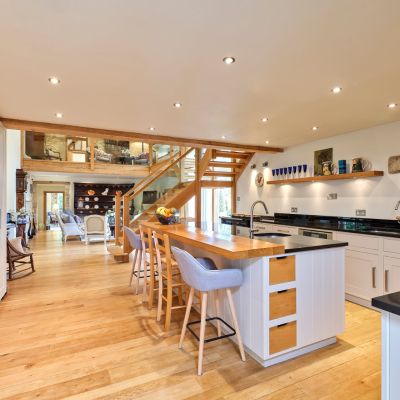 The principal living space forms the heart of the house and is particularly striking in both scale and design. Arranged as an open-plan kitchen, dining and sitting room, it is defined by its vaulted ceiling, exposed beams and impressive glazing, all of which create a bright and airy interior with a strong architectural identity. The sense of space is enhanced by a mezzanine gallery above, while the overall layout is well suited to both everyday living and entertaining. Oak flooring and carefully chosen finishes contribute to the cohesive and well-considered feel of the house.
