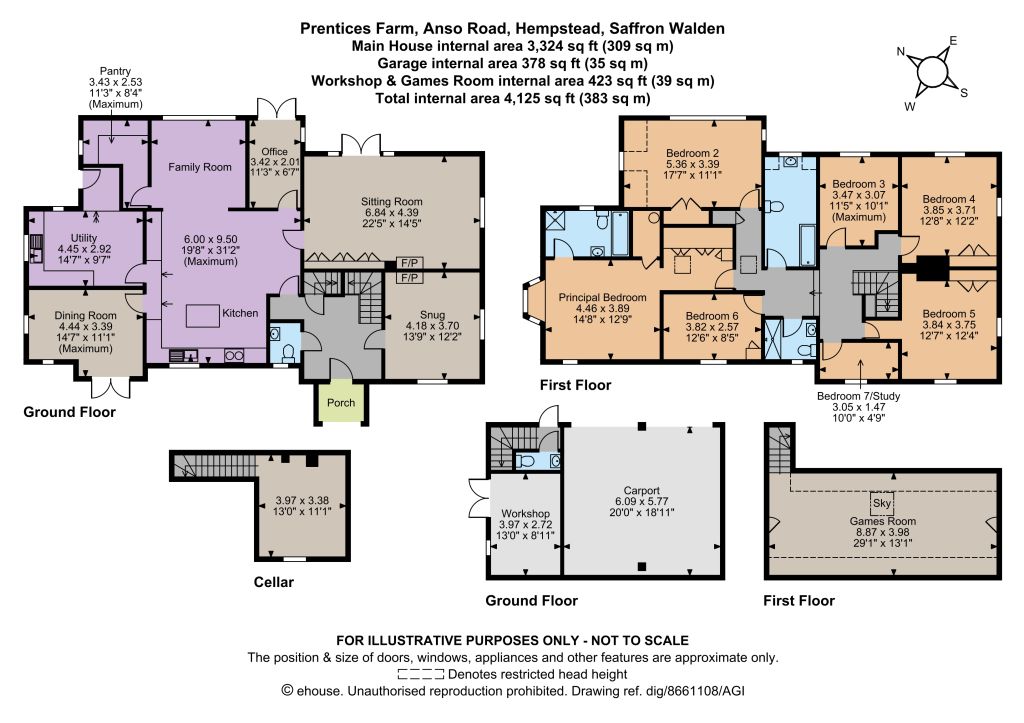 Having plenty of kerb appeal, the property is approached through a five-bar gate over a gravelled rear driveway providing private parking and giving access to a detached double cartlodge with an EV charging point and an attached workshop. A door opens to a hallway with a cloakroom and stairs rising to a vaulted 29ft first floor room, currently used as a games room but with the potential to create a self-contained annexe if required (STP). The well-maintained wraparound garden surrounding the property is laid mainly to gently-sloping lawn interspersed with and bordered by mature shrubs and trees. There is also an enclosed kitchen garden, a productive orchard, a cedar ‘Gabriel Ash’ greenhouse, a range of other small timber outbuildings, an all-weather tennis court and paved front and rear terraces, both ideal for entertaining and al fresco dining and offering far-reaching views over surrounding farmland including spectacular sunrises and sunsets.