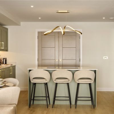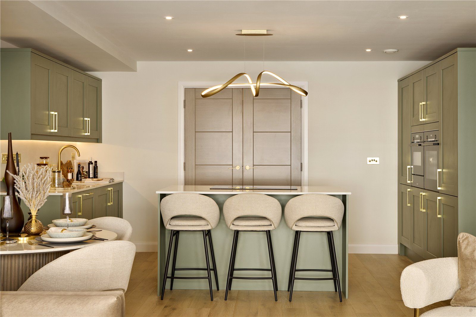 Nestled on the first floor, Apartment 1 has a magnificent 28ft open plan living, dining kitchen, creating the perfect space for entertaining. Designed with opulence in mind the kitchen area is flanked with contemporary wall and base Shaker-style units in reed green with brushed gold handles ans complimentary 20mm solid worksurfaces, providing plenty of storage. A centrepiece to the kitchen is a large central kitchen island with breakfast bar for informal dining. There are modern integrated appliances to include Bosch microwave combination oven, warming drawer, oven and induction hob. Matrix dishwasher and fridge freezer. CDA wine cooler and a 4in1 boiling hot water tap. The remaining space, configurable to the purchasers’ own requirements, has expansive picture windows that flood the space with plenty of natural light. There is ample space for a good-sized table and chairs and a separate seating area. There are two well-proportioned king-sized, double bedrooms each boasting a separate fitted dressing room and contemporary en suite providing a boutique feel to your home. Completing the accommodation is the added convenience of a separate WC and a useful utility room.