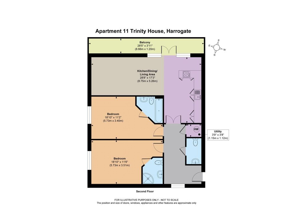This impressive top floor apartment comprises a splendid L-shaped 28ft open plan living, dining kitchen that has been designed with opulence in mind. The kitchen area features contemporary Shaker-style wall and base units in a reed green with complimentary 20mm solid Quartz worksurfaces and splashback, providing plenty of storage. There are modern integrated appliances to include a CDA fan single oven and canopy extractor. Matrix frameless ceramic hob, dishwasher and fridge freezer and a single lever swan neck tap. There is also a breakfast bar for informal dining. French doors flood the room with natural light and provides access to the impressive 28ft private balcony. This peaceful retreat is the perfect place in which to relax and unwind whilst being bathed in south-easterly facing daylight and is also ideal for entertaining and al fresco dining. The remaining space, configurable to the purchasers’ own requirements, has ample space for a good-sized table and chairs and a separate seating area. There are two well-proportioned double bedrooms of equal size with one being service by a contemporary en suite shower room and the second by a modern bathroom. Completing the accommodation is the added convenience of a separate WC and a useful utility room.