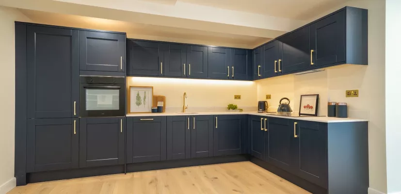 Conveniently located on the first floor Apartment 7 comprises a spacious 31ft open plan living, dining kitchen with a south-easterly facing Juliette balcony that floods the room with natural light, creating the perfect space for entertaining. The kitchen has been designed with opulence in mind and features contemporary wall and base Shaker-style units in indigo with brushed gold handles, complimentary 20mm solid Quartz worksurfaces and splashback, in an L-shaped providing plenty of storage and creating a division between the living and dining space. There are modern integrated appliances to include a CDA fan single oven and canopy extractor. Matrix frameless ceramic hob, dishwasher and fridge freezer and a single lever swan neck tap. The dining area has ample space for a good-sized table and chairs, and the living area offers plenty of room for multiple seating arrangements.
