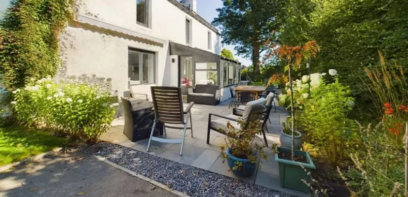 Outside The garden has a southerly aspect and is screened from the Deeside road by a high garden wall and mature beech trees. Within the garden are a variety of broadleaved trees and there is a lawn to the west. The property is approached through an entrance gate with a tarred drive on to Arbeadie house. There is parking for several cars around the house.