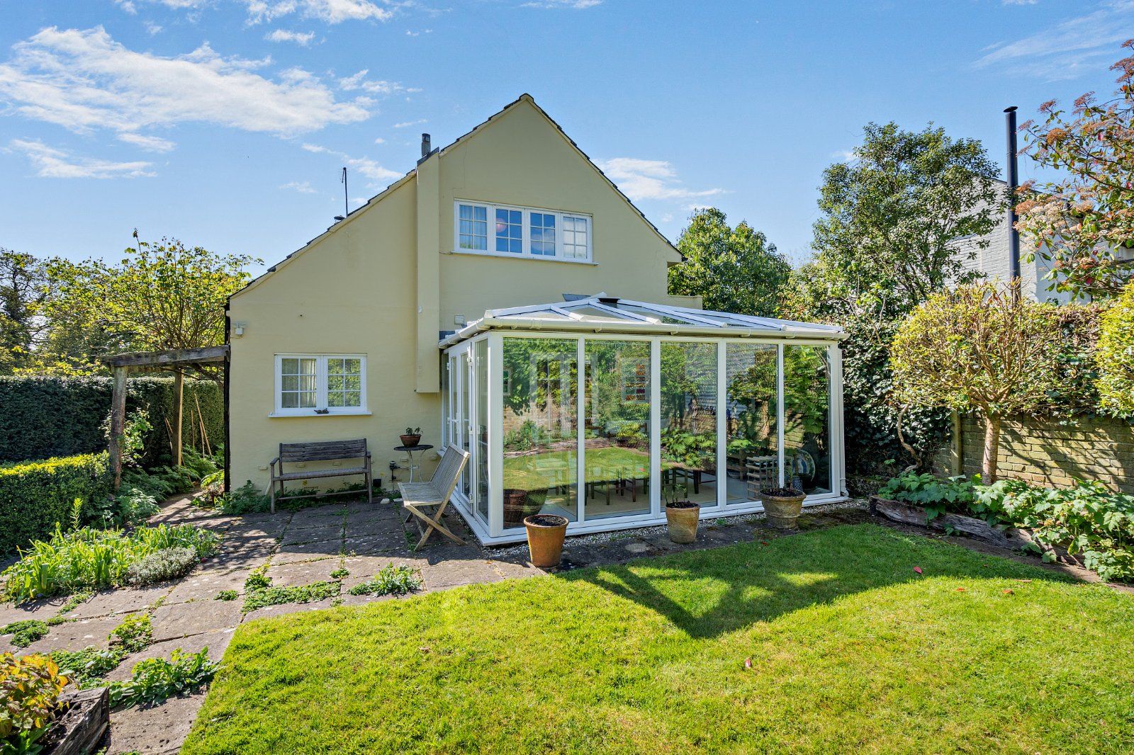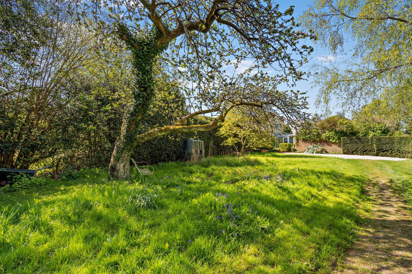 The property is set within a well-maintained cottage-style garden, with a stone-paved terrace adjoining the house and an area of level lawn beyond, bordered by mature hedging and well-stocked planting beds. The grounds enjoy a high degree of privacy and quiet and are surrounded by the attractive village green, trees and farmland.