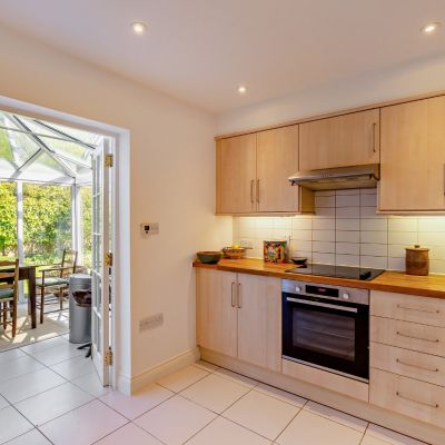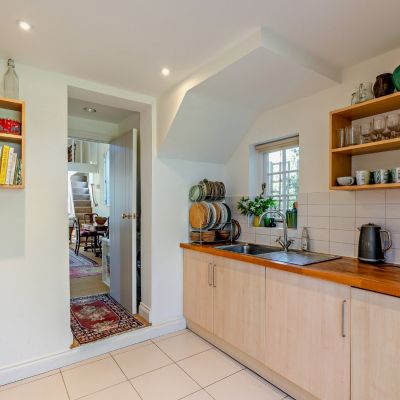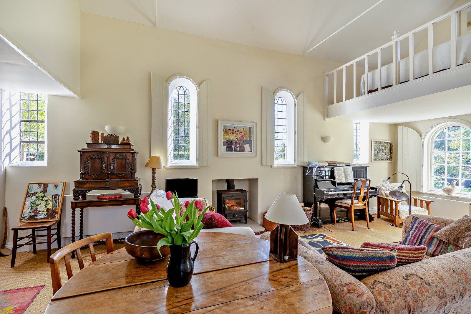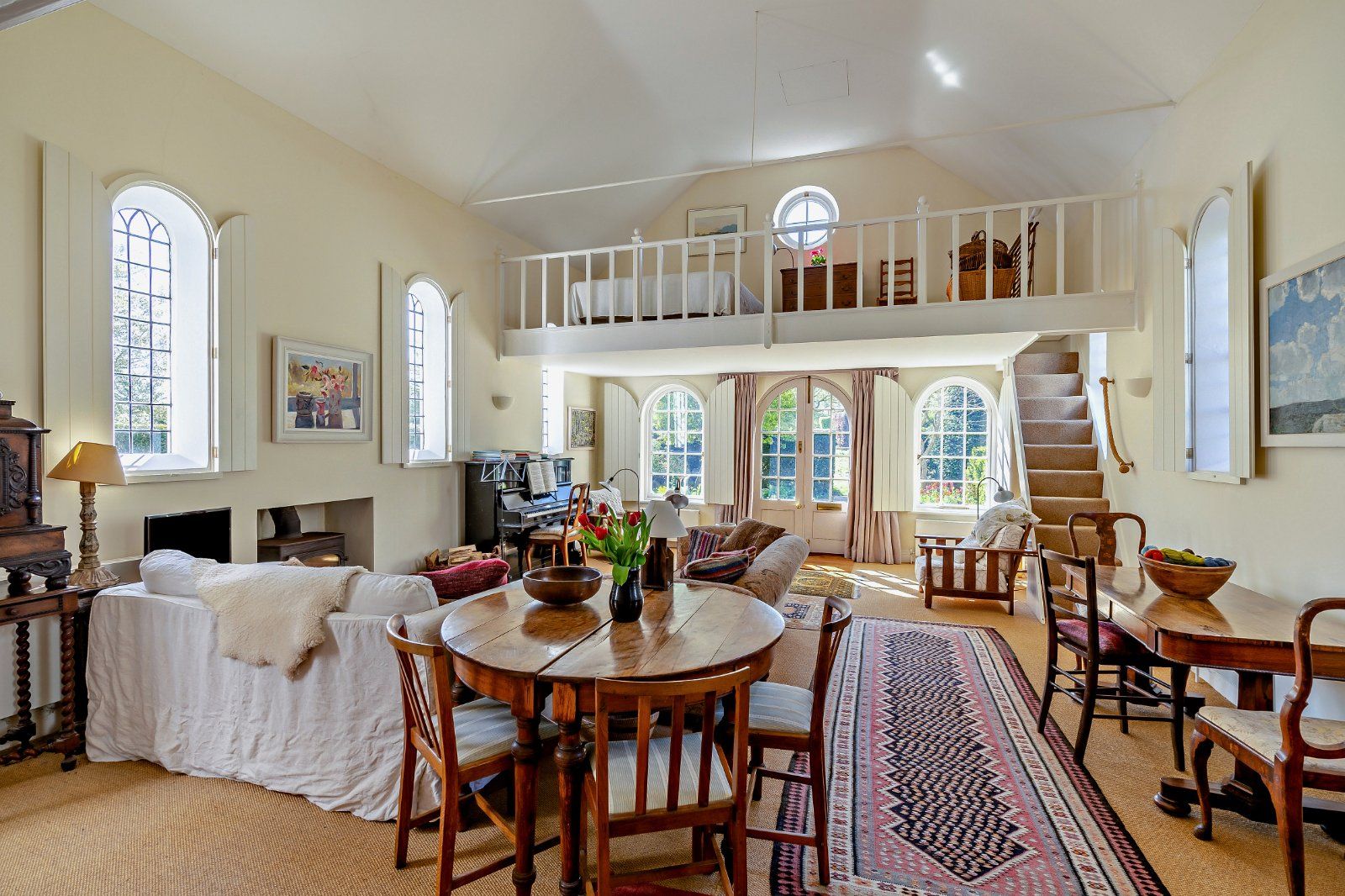 The principal reception space is the expansive double-height drawing room, where tall arched windows with bespoke internal shutters allow for an abundance of natural light. A central wood-burning stove provides an attractive focal point, while the open-plan layout enhances the sense of space. The adjoining kitchen is well appointed with light wood cabinetry and wooden worktops and opens through to a bright conservatory, providing an ideal setting for dining with views over the walled garden. A well-presented family bathroom completes the ground floor.
