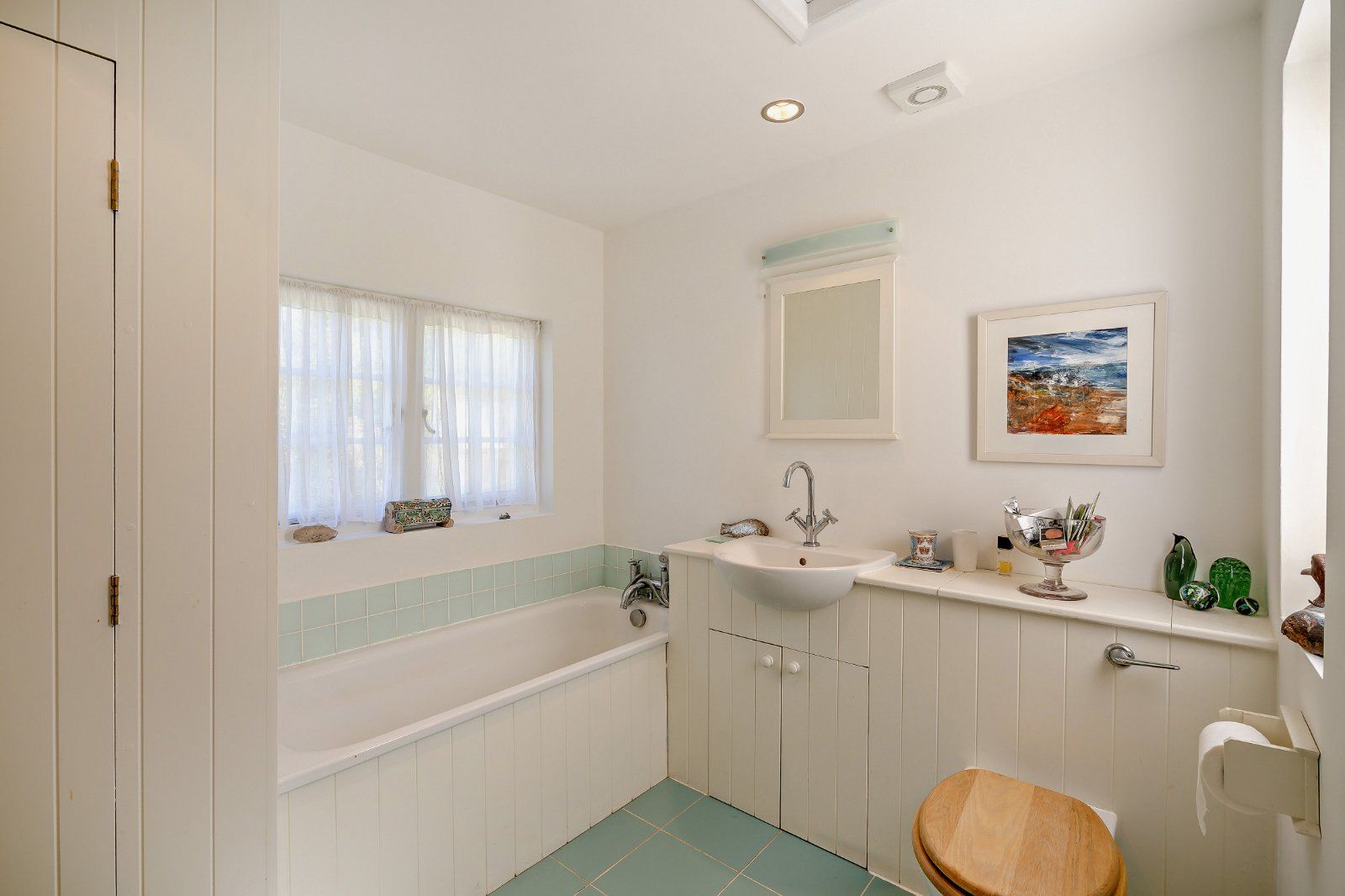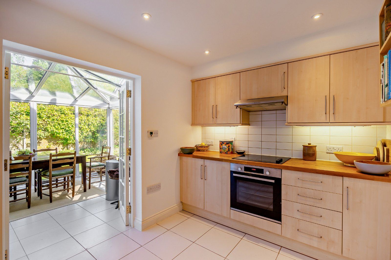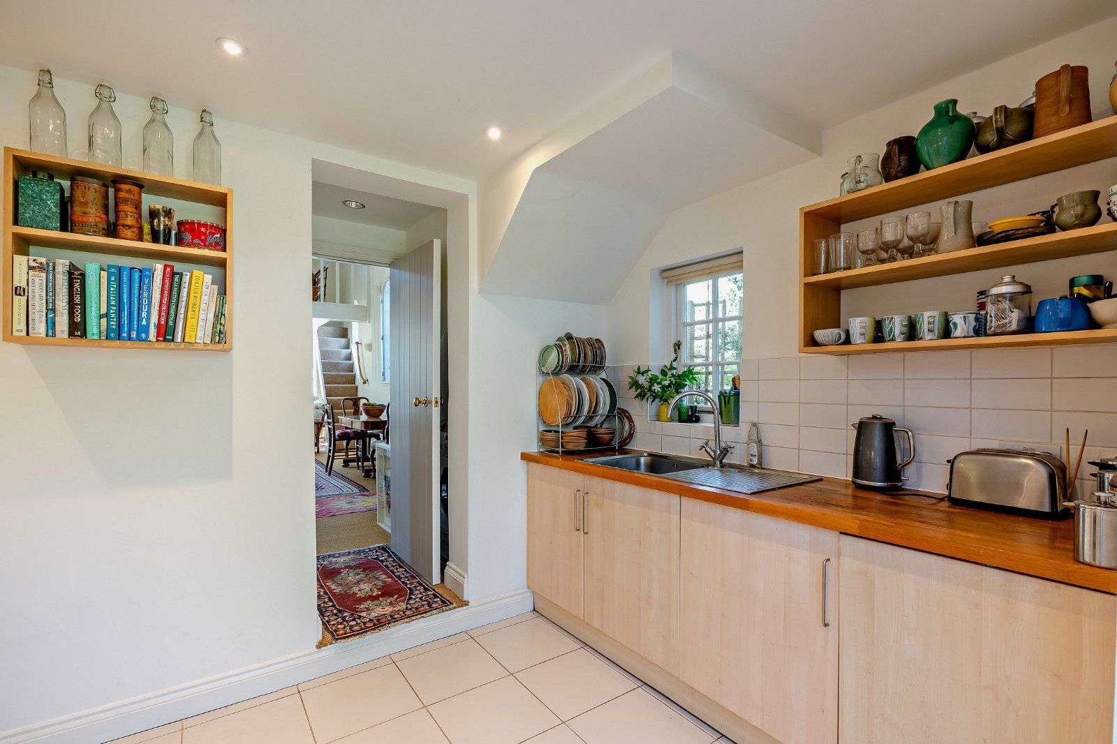 The principal reception space is the expansive double-height drawing room, where tall arched windows with bespoke internal shutters allow for an abundance of natural light. A central wood-burning stove provides an attractive focal point, while the open-plan layout enhances the sense of space. The adjoining kitchen is well appointed with light wood cabinetry and wooden worktops and opens through to a bright conservatory, providing an ideal setting for dining with views over the walled garden. A well-presented family bathroom completes the ground floor.