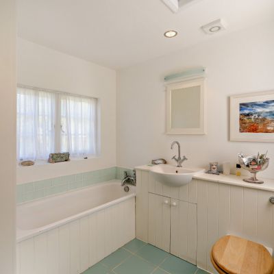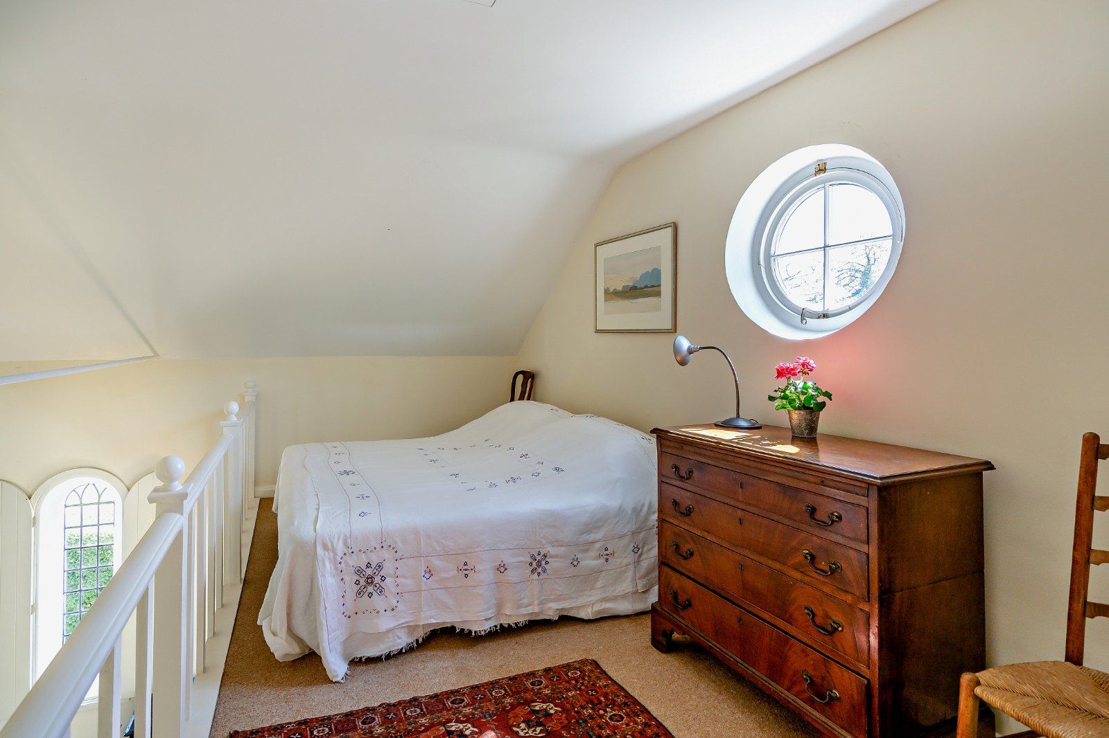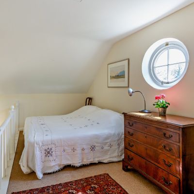 On the first floor, there is a galleried mezzanine with an attractive circular window overlooking the main living space. The generous bedroom has built-in storage and an en suite cloakroom.