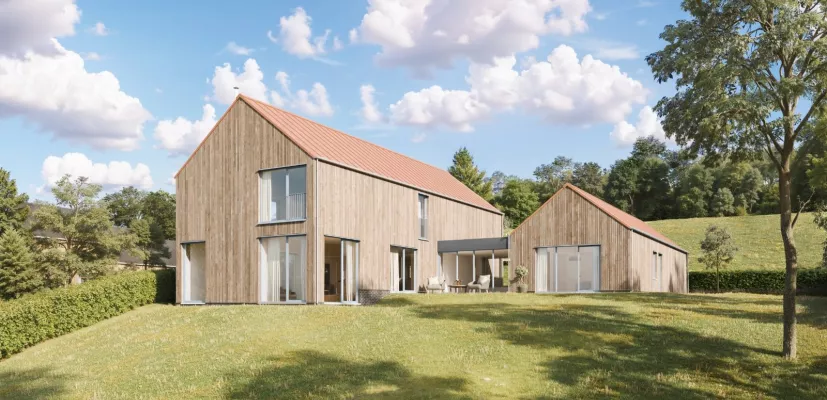 This spacious home has been designed with a focus on natural materials, high thermal performance and elegant contemporary style. The exterior features sustainably sourced, untreated European larch cladding paired with long-lasting pre-coated metal roofing, selected for exceptional durability and resistance to UV rays and corrosion. Arbo high-performance timber and aluminium-clad windows flood the interiors with natural light, while double-glazed units ensure outstanding insulation and reduced heat loss. Several first-floor bedrooms also enjoy Juliette balconies, enhancing the connection to the surrounding landscape.