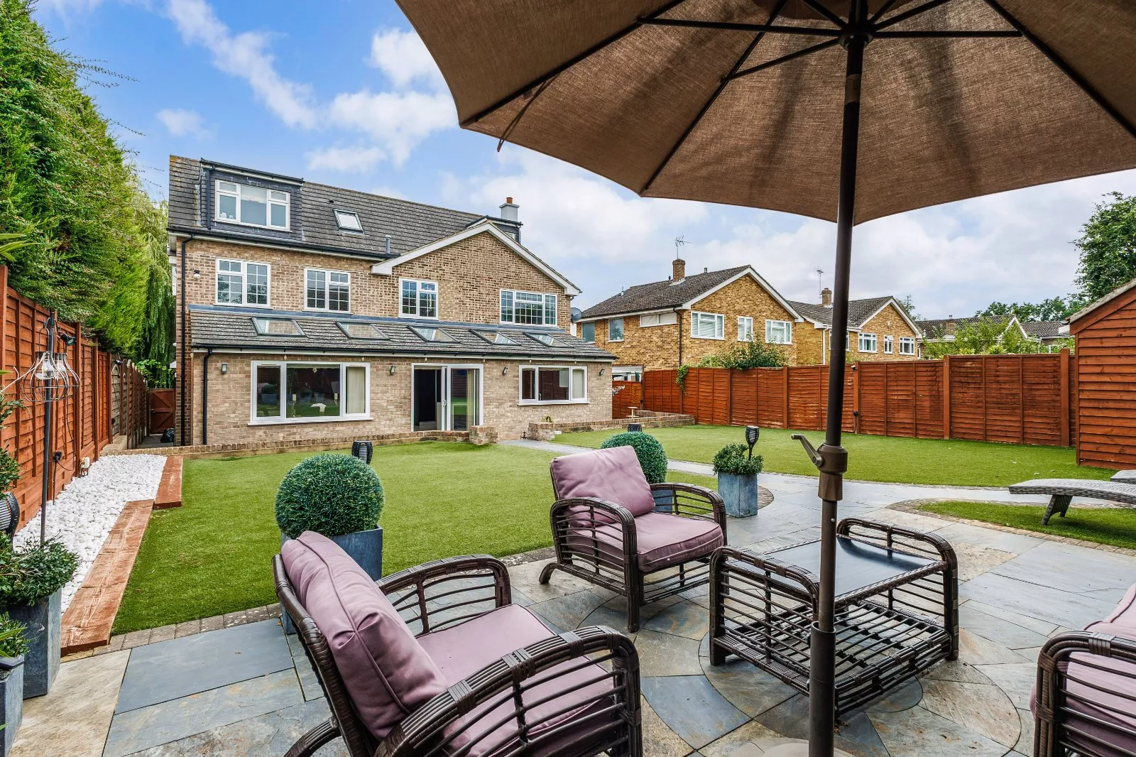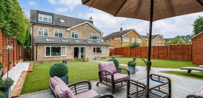 Of particular note is the rear extension which spans the back of the house, creating a wonderfully bright and spacious open plan kitchen and living area which serves as the heart of the family home. Here, the contemporary design incorporates excellent storage within sleek cabinetry and a central island which doubles as a breakfast bar, premium NEFF appliances and stylish quartz work surfaces, plus large-tiled flooring with gas underfloor heating. The generously proportioned room also has space for a dining area and a snug, making one fabulous area for entertaining. Separate to the kitchen/dining/family room there is a formal sitting room at the front of the house, warmed by a wood burning feature fire place. Tucked away to the side of the house is a separate utility room with access to the front making this an ideal space for a boot room and for laundry machines, while a cloakroom with WC completes the ground floor.