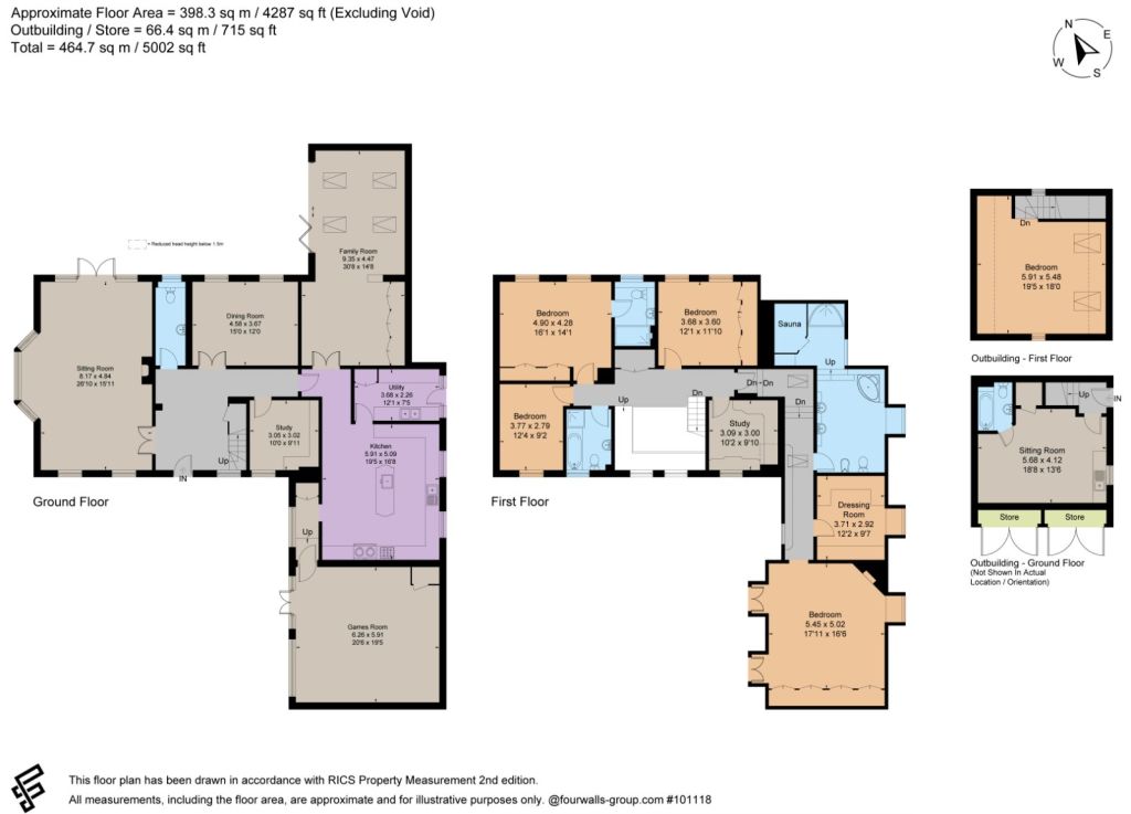 On the first floor, the spacious principal suite comprises a sizeable bedroom, a dressing room, a luxurious bathroom and an adjoining shower room, complete with a sauna. A guest room with en suite shower room, three further bedrooms and a family bathroom complete the arrangement on this floor
