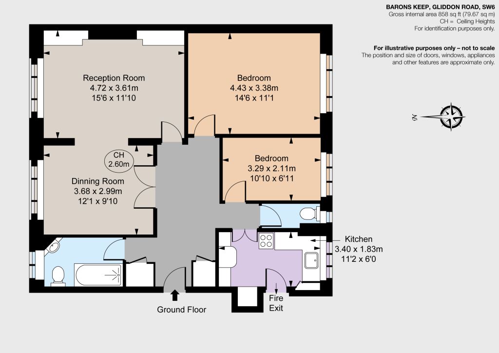 Located on the ground floor of this private gated development, the property consists of 858 sqft of internal space. The property benefits from a large double reception room over looking the communal garden, currently laid out as a reception room and dining room. There would be potential to create a third bedroom in the dining room area if required. There are two double bedrooms a family bathroom and kitchen and the benefit of a separate WC also.