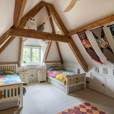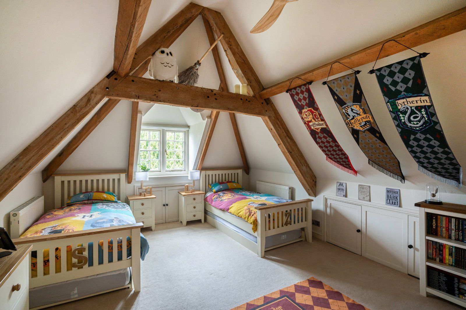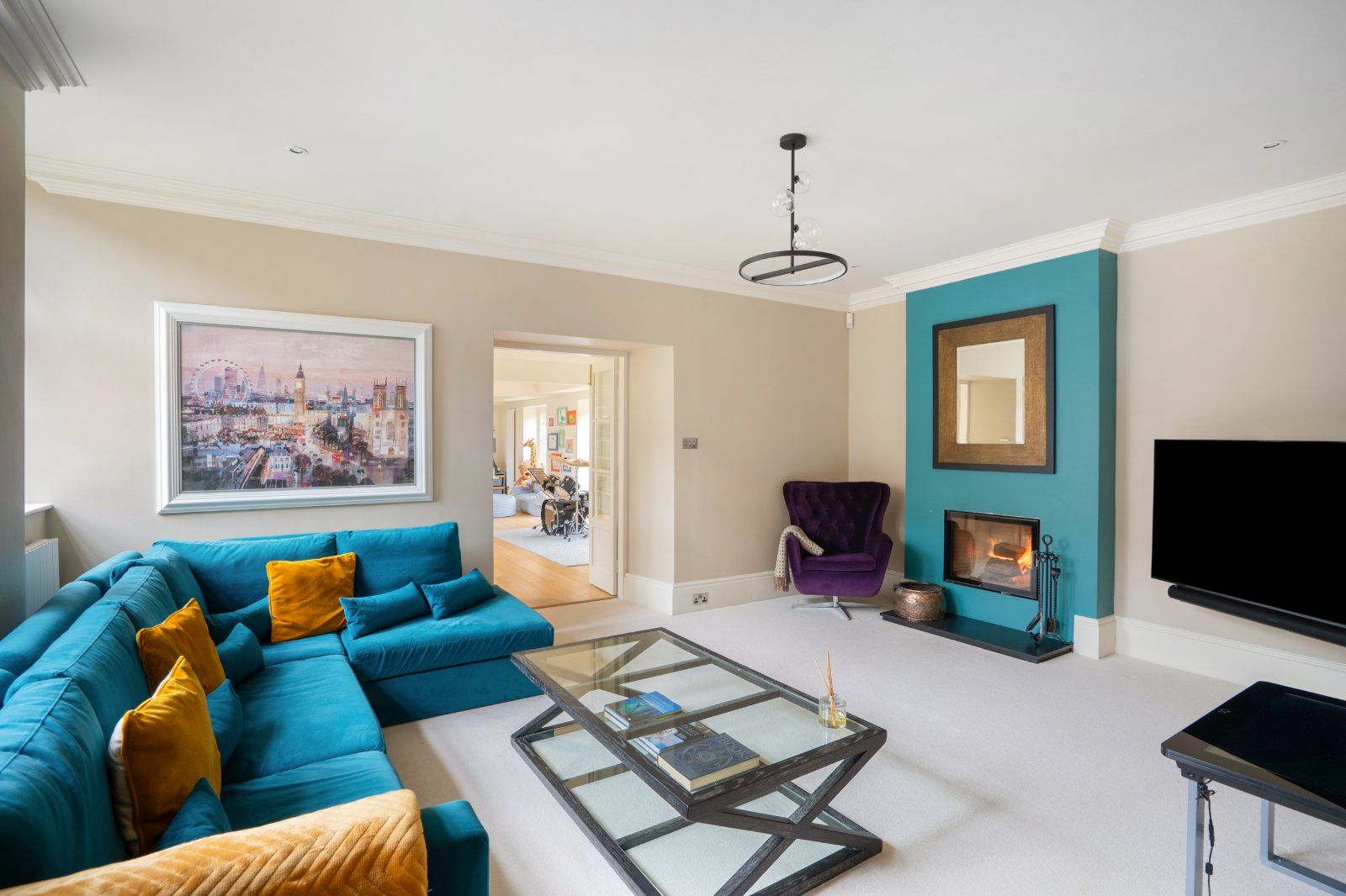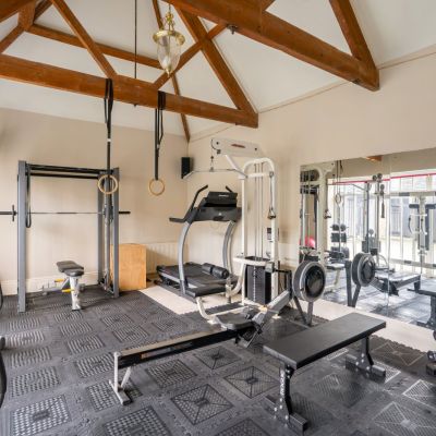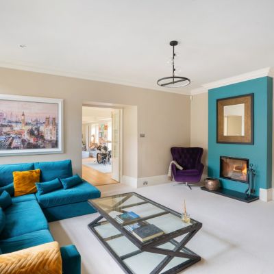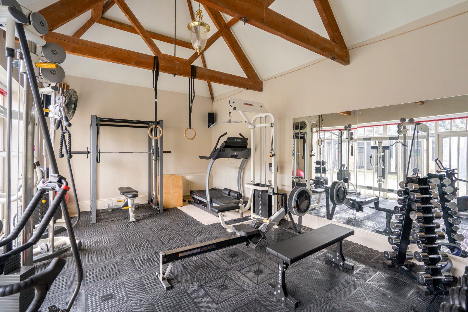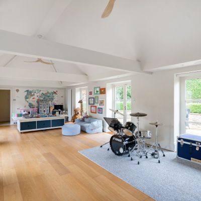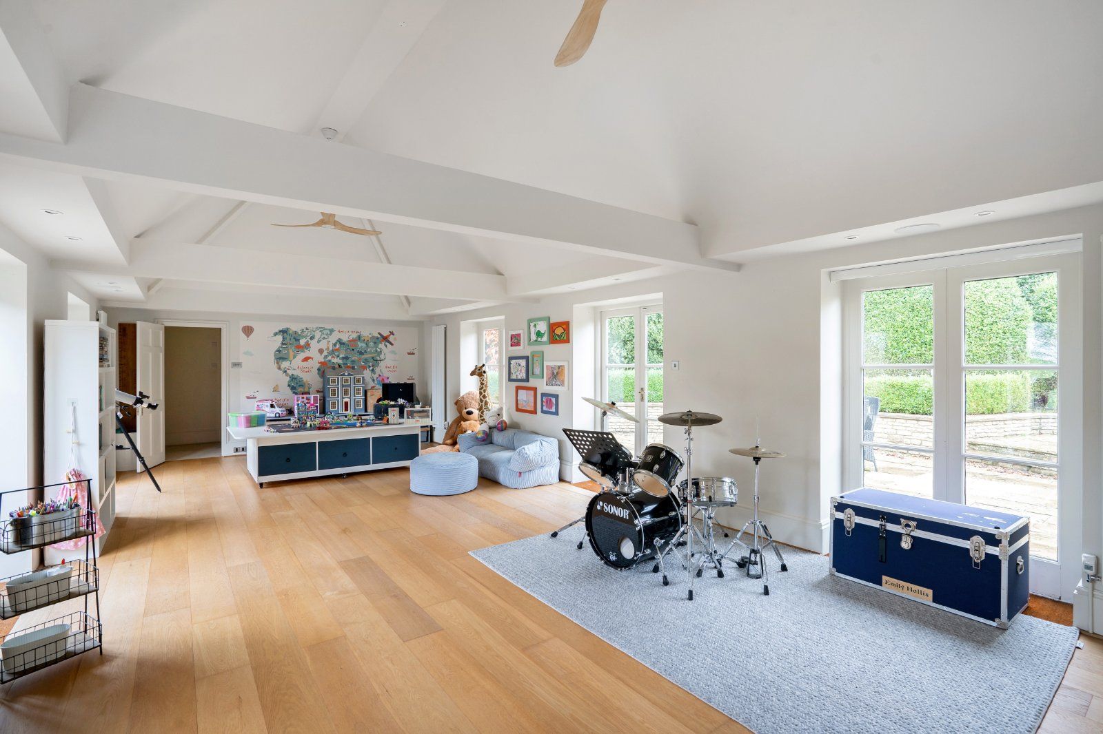 One of the most notable spaces is the large playroom, a bright and adaptable room which offers excellent flexibility and could equally serve as a secondary sitting room, studio, or informal entertaining space. A separate study provides a quieter environment for home working, while the ground floor is further enhanced by a gym/ancillary accommodation with its own access.