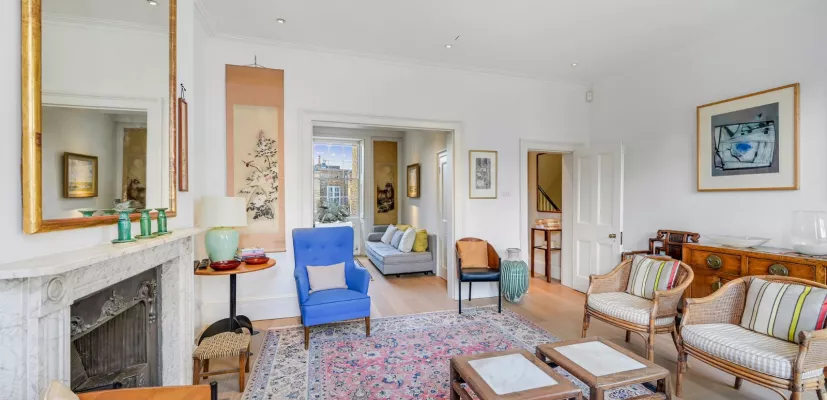The house offers excellent entertaining space with an elegant, first floor drawing, kitchen / dining room on the raised ground floor with sunroom to the rear, and a charming summer house at the end of the garden, ideal for use as a home office or gym. The extremely spacious principal bedroom suite is situated on second floor, with extensive fitted storage, a large bathroom and fabulous south-facing windows that flood the room with natural light. There are two further double bedrooms and two shower rooms. In addition, there is a utility room and beautiful paved garden.