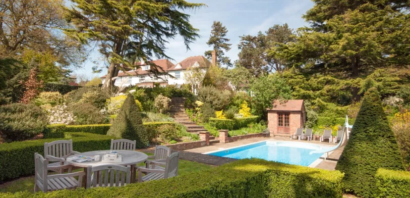 Stunning and extensive gardens surround the house, including lawns and a wealth of mature trees to the front and rear, sunny south-facing patios and landscaped ornamental gardens with a beautiful David Austin designed rose garden, box hedging, a pond with a central fountain and paved and brick pathways leading to a sheltered, outdoor swimming pool. There are also lawns and meadows with mature trees, orchards and established hedges, together with an all-weather tennis court.