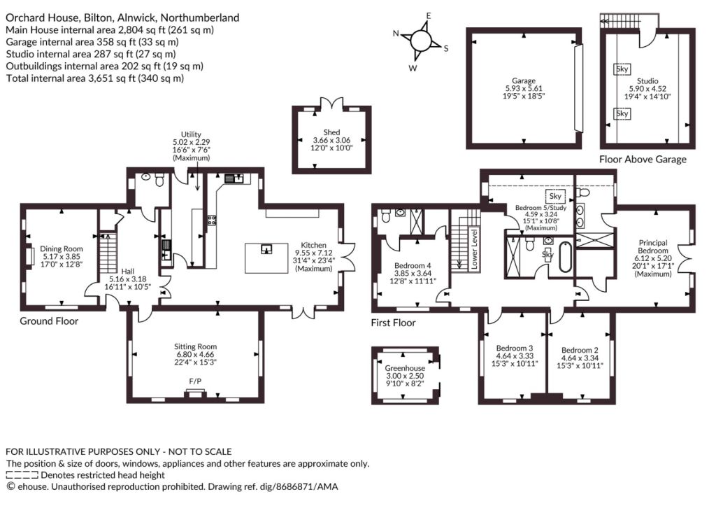Outside, the gardens are predominantly arranged to the front of the property, taking full advantage of the south-facing aspect and the wonderful views towards Alnmouth and the coast. A substantial patio provides an ideal setting for outdoor dining, leading to a well-maintained lawn bordered by established planting, including shrubs and hedgerows. Vehicular access is to the side, where a driveway continues to the rear, providing parking and access to a detached garage, above which there is a useful and versatile studio space which, among other uses would be a great space for a gym, home office, craft room or art studio.