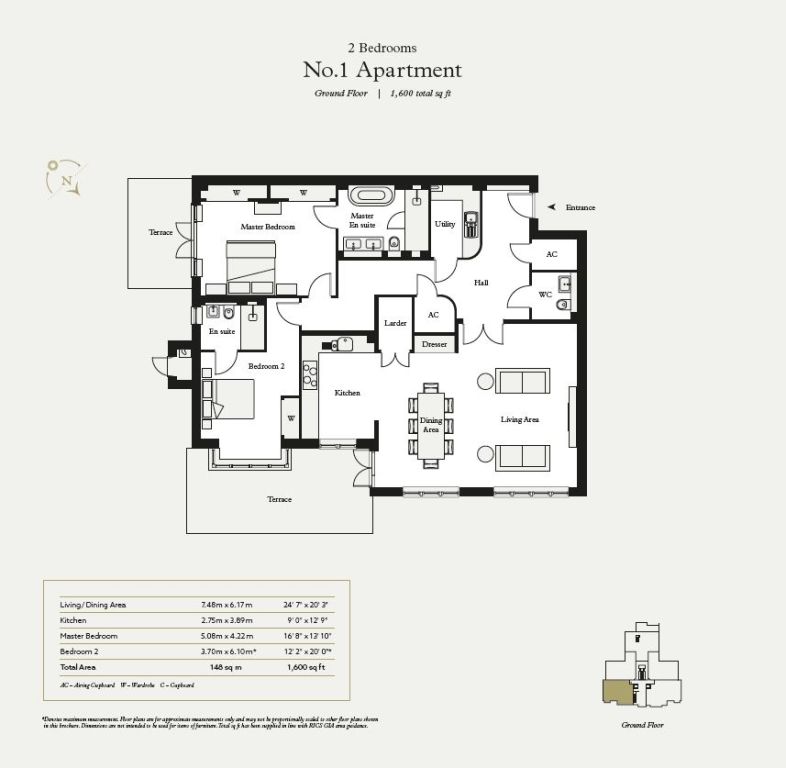Plot 1, located to the front of the ground floor, has 2 double bedrooms including en suites, as well as both benefiting from having a set of patio doors leading onto a private terrace, ideal for relaxing on. In addition to this, an open plan kitchen, living room and dining room with access onto the private terrace provides a delightful open and airy living space. It also features a walk-in pantry built by Charles Yorke bespoke Kitchens.