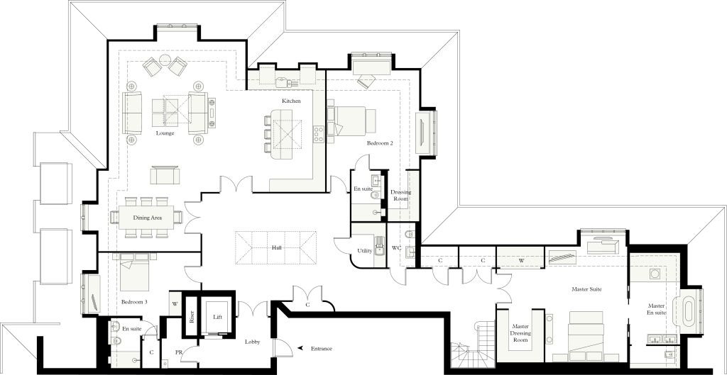 This award-winning 3 bedroom 3 bathroom Penthouse with Air conditioning and underfloor heating, is beautifully proportioned with plenty of light and open space for living a modern lifestyle. The Apartment is situated on the 2nd floor and has its own inner lobby area where the lift operates from. The lift is programmed with a unique code that allows only the occupants to access at this level.