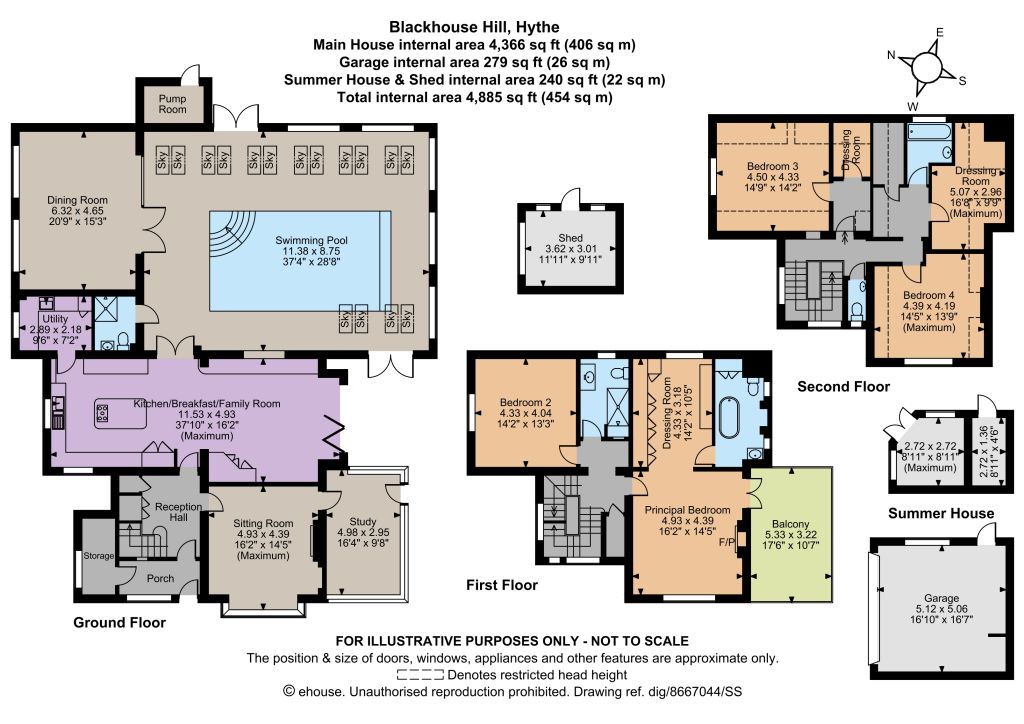On the first floor the property provides two double bedrooms and a family shower room. The principal suite has a fireplace, fitted dressing room, a modern en suite bathroom with freestanding bath, and double doors to a private balcony with stunning views towards the coast. The two remaining double bedrooms and a further family bathroom with separate cloakroom can be found on the second floor. Both have vaulted ceilings and separate adjacent dressing rooms, with far reaching views.