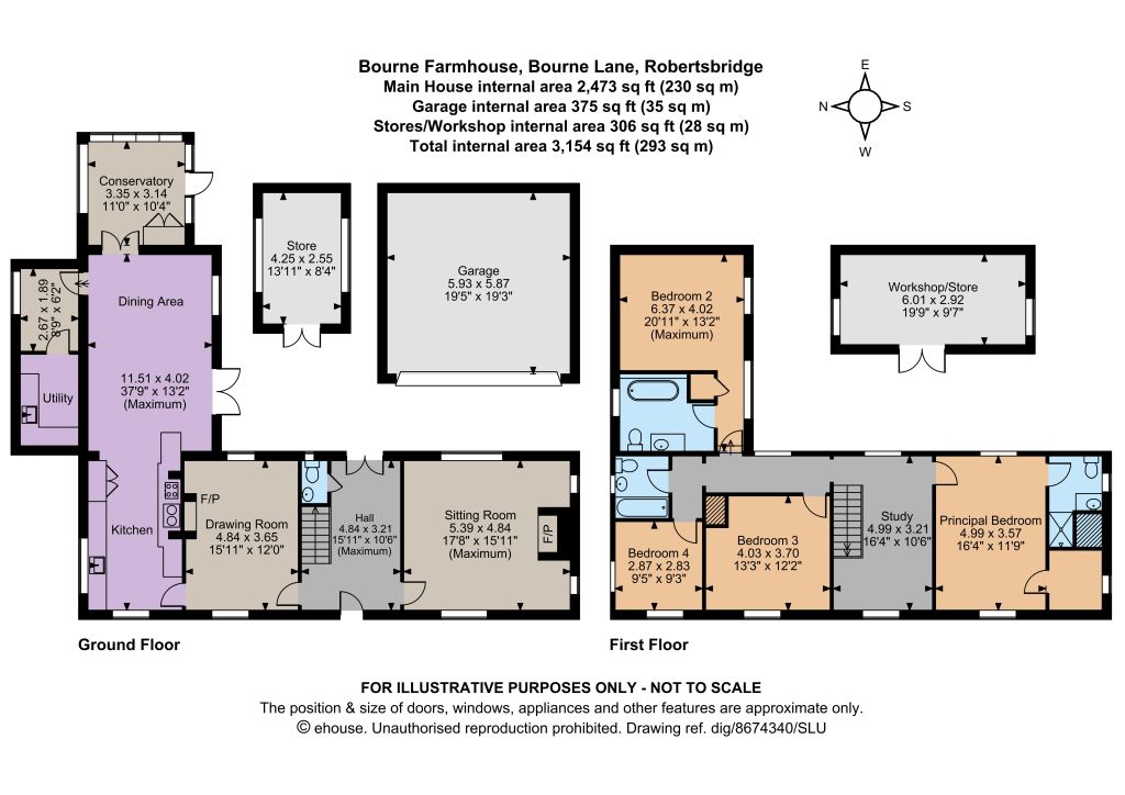 The generous L-shaped first floor landing has space for a study area and gives access to the property’s four bedrooms and a family bathroom. The principal bedroom has a walk-in store/dressing room and an en suite shower room. One of the remaining bedrooms benefits from an en suite bathroom with freestanding bath.