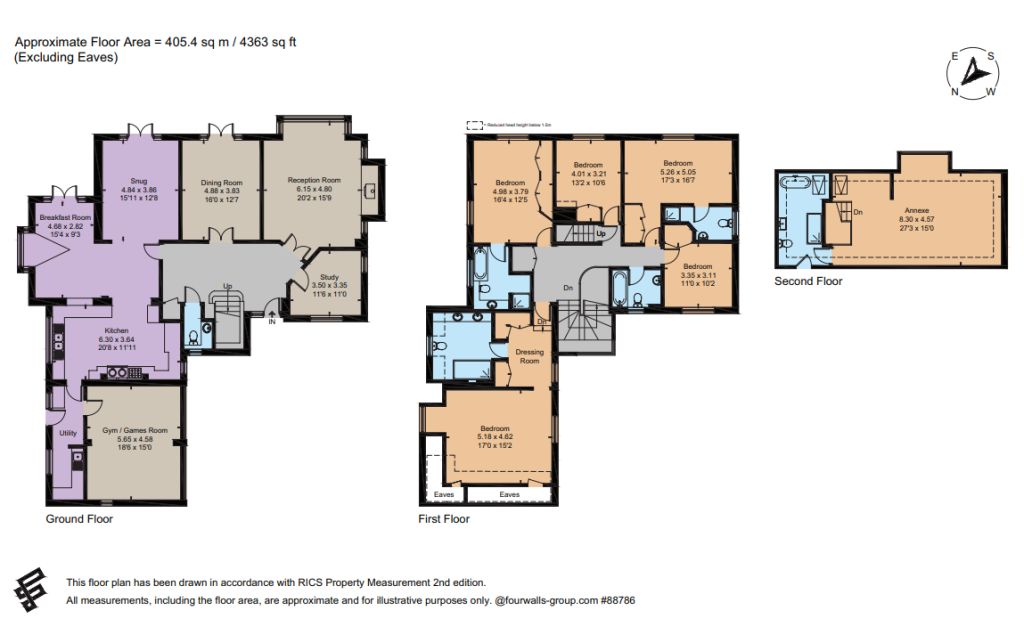 Upstairs there are five double bedrooms on the first floor, including a principal bedroom with dressing room and luxury en suite and two further en suite bathrooms together with a family bathroom. The second floor consists of an extensive open plan room with a bedroom area, seating area and study area as well as an en suite bathroom, which could serve well as a self-contained annexe or au pair’s suite.