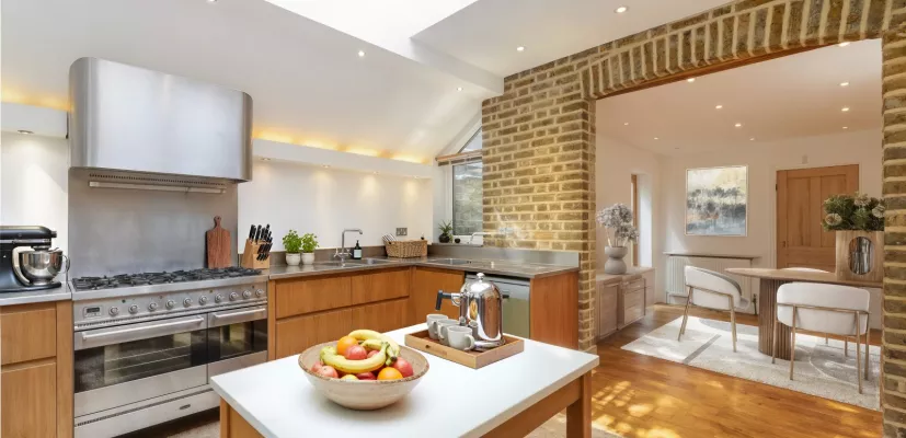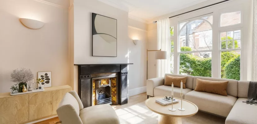The property retains many of the original period features including high ceilings, sash windows and an elegant, stylish finish throughout, with cornicing and ceiling roses. The ground floor features a tiled hallway leading to a double reception room and separate dining room, providing a vast living area and wonderful entertaining space. The kitchen features a striking glass ceiling and bifold doors opening onto the north-west facing garden, flooding the kitchen with natural light. The well-equipped kitchen includes a Range cooker, spacious American refrigerator and full-size dishwasher.