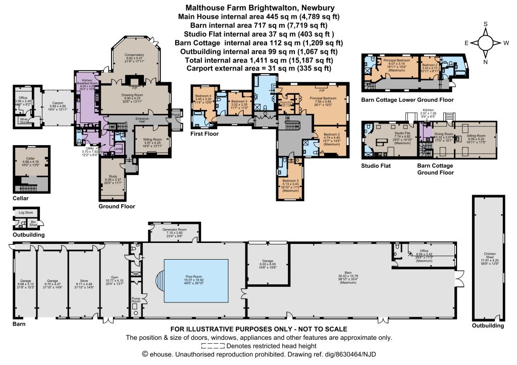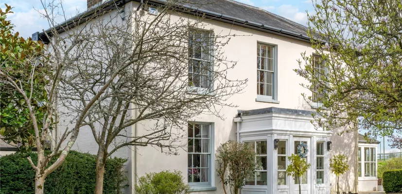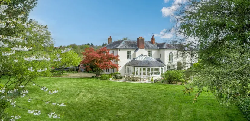 Malthouse Farm is a spacious family house occupying a commanding position in the North Wessex Downs, close to Newbury. The house bears all the hallmarks of a smart country house, with period detailing, and large Georgian sash windows filling the house with natural light and providing views out over the stunning rural scenery. Malthouse Farm extends to approaching 5,000 sq ft in the main house and of particular note is the 30' drawing room at the core of the house. The kitchen/breakfast room links to a large orangery style dining room which looks out over the gardens and longer views. The kitchen is well fitted with a range of bespoke cabinetry, a 4-door Aga range cooker, attractive limestone floor and full height windows looking out over the garden terrace and providing plenty of natural light. In addition there is also a cosy family sitting room with a wood burning stove, a generous study/playroom, and an office. An attractive Georgian style staircase rises to the first floor where a lovely light and spacious landing gives access to an impressive main bedroom suite, and four further bedrooms, all with their own en suite bathrooms.