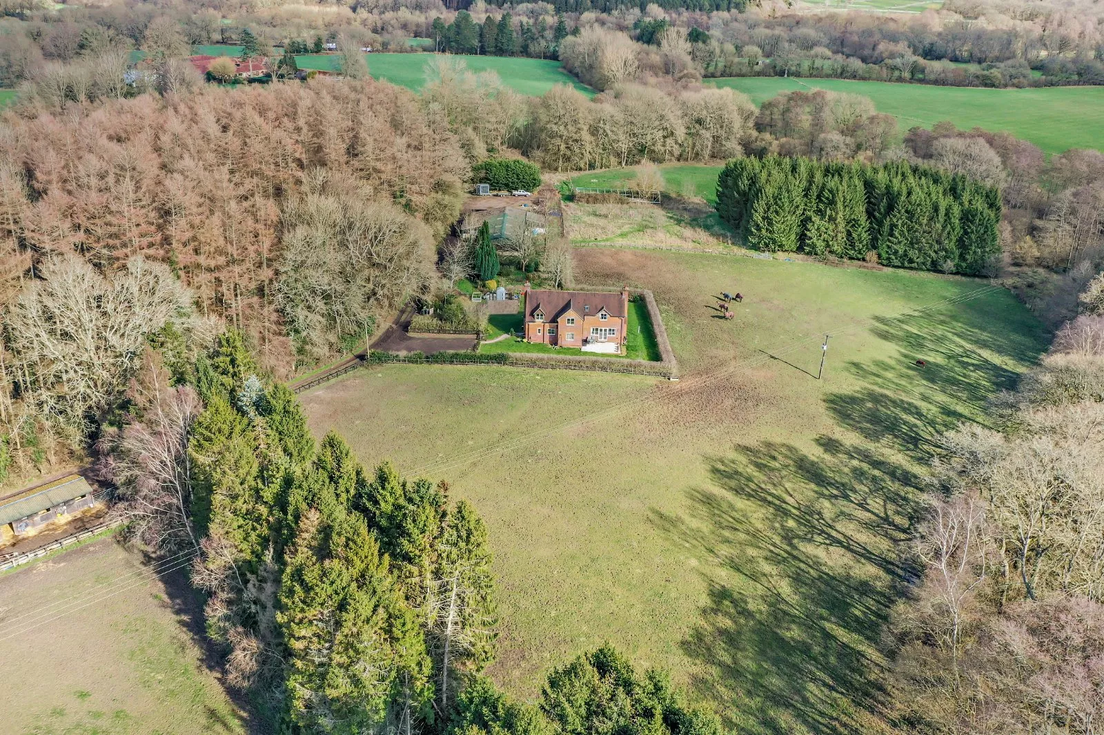A peaceful farm site with a modern farmhouse, outbuildings and extensive paddocks