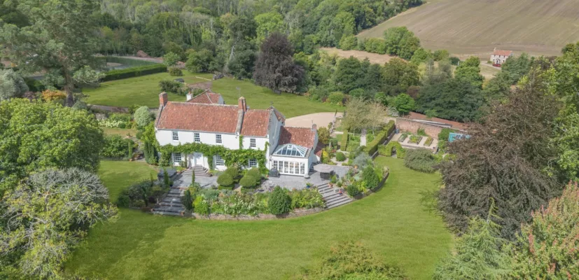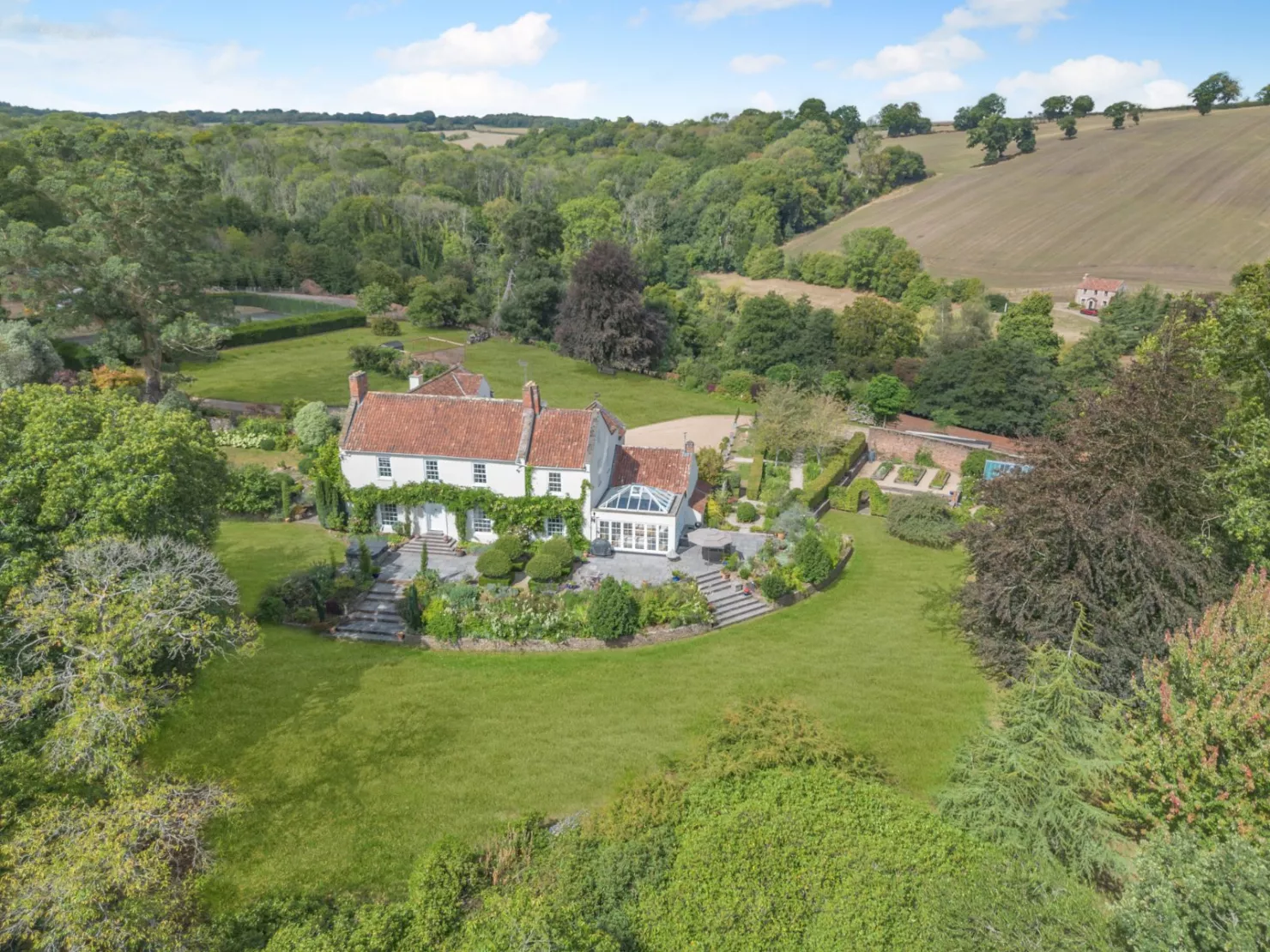 The property is approached via a long, treelined lane and offers ample parking on a gravel driveway to the front of the house. The garden surrounding the property includes spacious areas of lawn, well-stocked border beds with various shrubs and flowering perennials, box hedging and a variety of mature trees. There is a sunny south and east-facing patio area at the back of the house, providing space for al fresco dining, while the grounds also include a tennis court and a kitchen garden with raised beds and a greenhouse. Beyond the garden, the wider grounds includes areas of meadow and shaded woodland, as well as a peaceful pond, providing a haven for wildlife