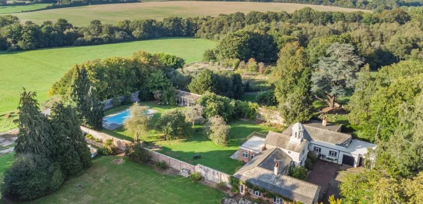 Hippocrene Farm is a handsome period house featuring five bedrooms and more than 3,000 square feet of beautifully presented accommodation, set in a peaceful rural position two miles from Uckfield town centre. The property has various splendid attractive features, including its bell tower and U-shaped layout, which wraps around the front courtyard area, while inside there are elegant, corniced ceilings. Most of the accommodation is arranged across the ground level, including the three well-proportioned, airy reception rooms. These include the formal drawing room with its brick-built fireplace, triple aspect and French doors opening onto the gardens. There is also an elegant dining room with a south and west-facing aspect, and a sitting room of similar proportions, with all three providing ideal space in which to relax as a family or entertain guests. There is also a well-equipped kitchen with fitted units to base and wall level and a stainless-steel range cooker, and at the rear, adjoining the kitchen in a semi open-plan layout, the sunny breakfast/family/informal dining room with its tiled flooring and French doors opening directly onto the walled garden. There are four bedrooms located in the east wing of the ground level. These include the generous principal bedroom with its study or dressing room and en suite bathroom, which has a bathtub and a separate shower unit. The ground floor also has a family bathroom, while upstairs there is one further large double bedroom with an en suite bathroom and French doors opening onto a stunning balcony, providing views across the delightful gardens. Extra accommodation could be available in the cottage, which is ideal as a rental property, or for use as a family annexe. It includes a comfortable sitting room, a kitchen and dining room and two double bedrooms, bathroom, and seculded private garden.