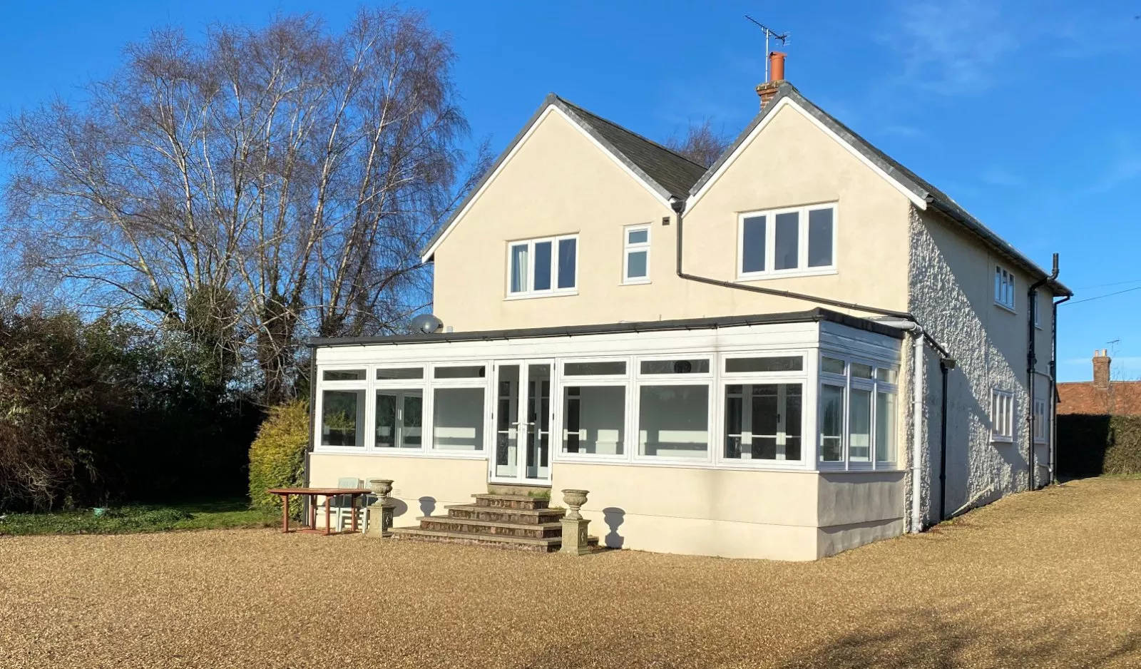 External:- Large Gravel Driveway Triple Garage Garden