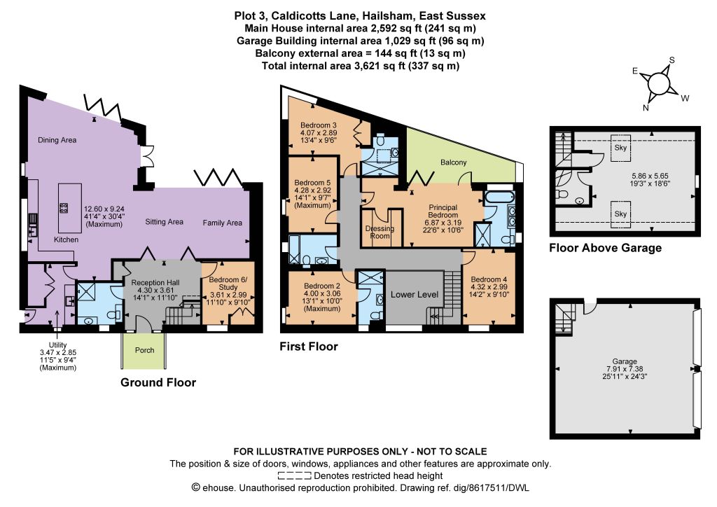 This stunning new home provides more than 2,500 sq. ft of elegant, contemporary living space with an open-plan layout and plenty of natural light throughout. There is a welcoming reception hall at the front with a galleried landing above, bi-fold glass doors opening onto the reception room and Karndean flooring, which continues into the open-plan living space. The 40ft, L-shaped sitting area, family area, dining area and kitchen is the heart of the home, with its two sets of south-facing bi-fold doors creating a connection to the outside space. There is a stylish modern kitchen with a central island and integrated appliances, as well as plenty of space for a seating are and a large family dining table. The adjoining utility room provides further space for storage and home appliances. The ground floor also has a shower room and one double bedroom, which could be used as a guest bedroom or as a study if required. Upstairs, the galleried landing leads to five further double bedrooms, all of which have clean, neutral styling and plenty of natural light. The luxury principal bedroom has bi-fold doors opening onto a sunny balcony, as well as a dressing room with fitted storage and an en suite bathroom. Two further bedrooms are en suite, while the first floor also has a family bathroom with an over-bath shower.