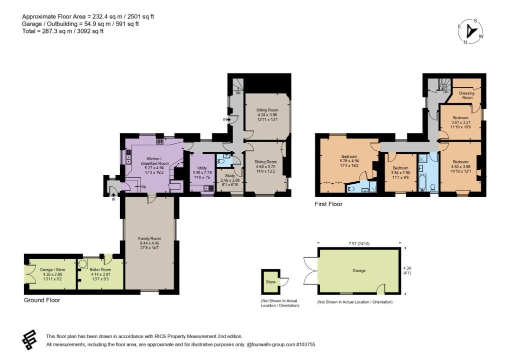 Upstairs are four bedrooms, the principal offering an en suite and a separate family bathroom with bath and shower.