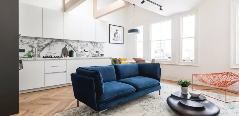 A striking open-plan living space is flooded with natural light from multiple skylights, creating a bold architectural setting that sets this property apart from a typical one-bedroom flat. Finished to a high specification with parquet flooring and underfloor heating, the apartment combines contemporary design with strong architectural character.