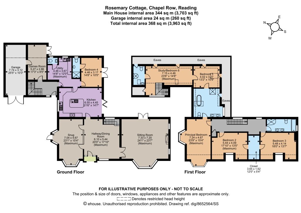 Upstairs all 5 bedrooms are generous in size and are light and airy. The principal bedroom enjoys a Jack and Jill bathroom that links to bedroom 5 and has extensive fitted wardrobes. Two further bedrooms have easy access to another two bathrooms and the bedroom on the ground floor has an ensuite. Additionally there is a garage, a large lightfilled studio room and a games room extension, linking to the main house.