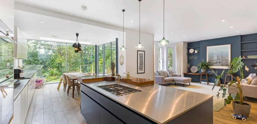 At garden level there is a stunning open plan living, kitchen/ dining area opening on to the beautiful south- west facing garden, there are two additional bedrooms both with en-suite shower rooms (one of which with access to street level) a separate guest w.c. and laundry room. There is an abundance of storage throughout the house and a separate plant room that also provides additional storage.