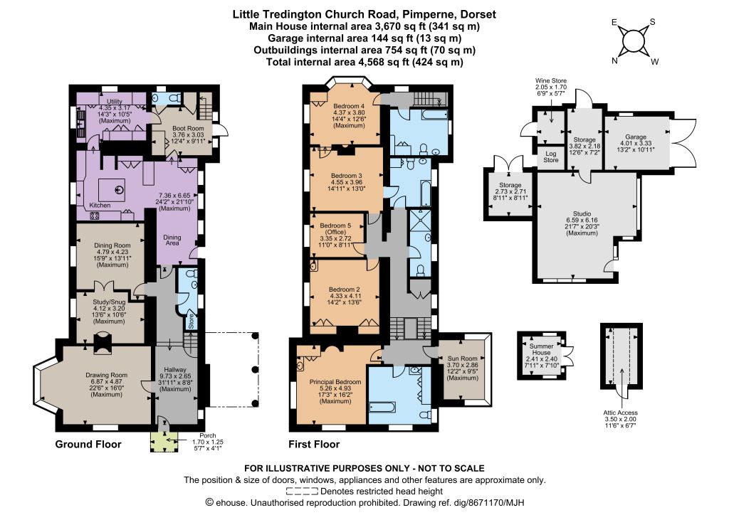 Little Tredington is approached through automated double gates and over a combined tarmac and gravelled driveway which leads to the house and turning circle. The driveway also extends around the front of the house and provides access to the courtyard where stands the studio, garaging and outbuildings.
