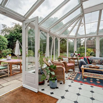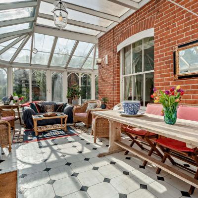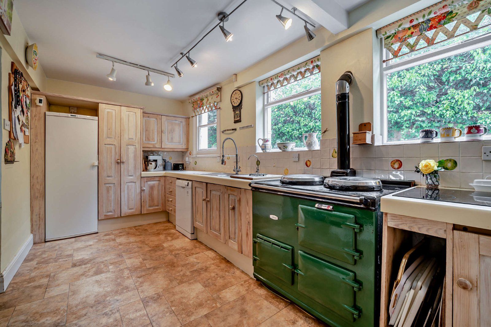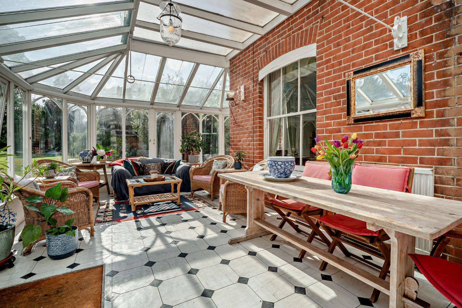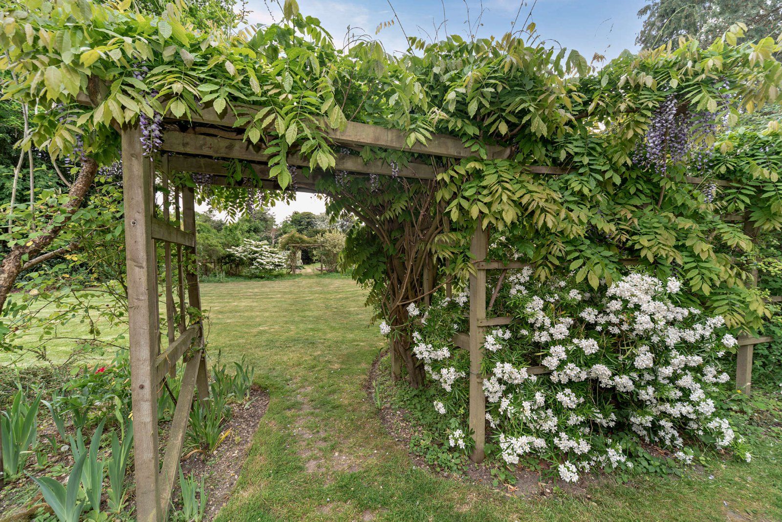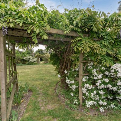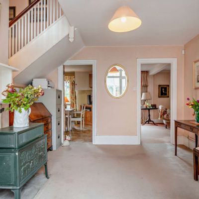 The far-reaching and well-maintained garden has an extended lawn as its centrepiece, bordered by well-stocked flower and shrub beds and mature trees. A tennis court sits towards the rear of the garden, whilst the lawn opens up to the side where a vegetable garden with raised beds and a fruit cage are located. Further lawn wraps around the tennis court, leading to an orchard at the rear of the garden.