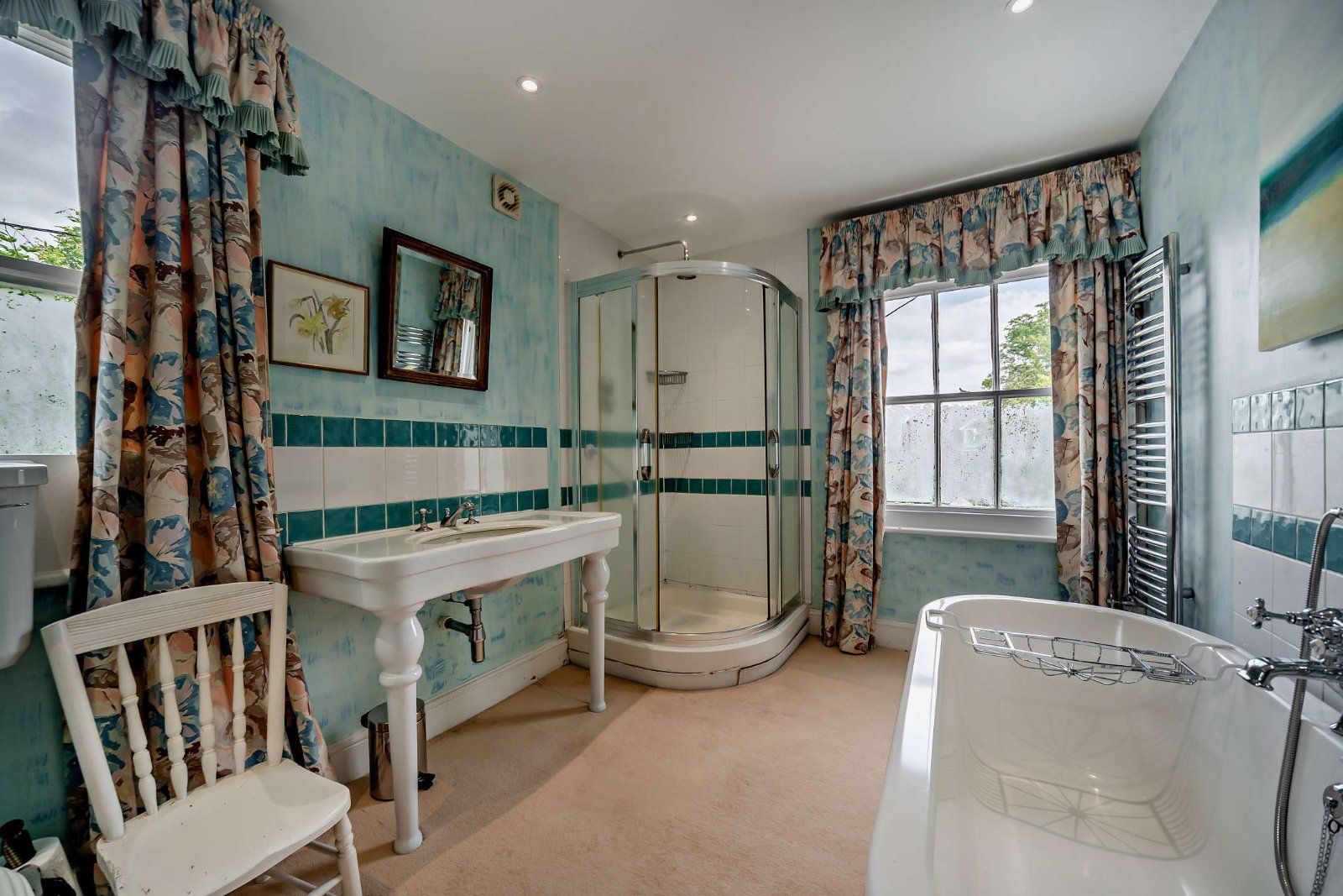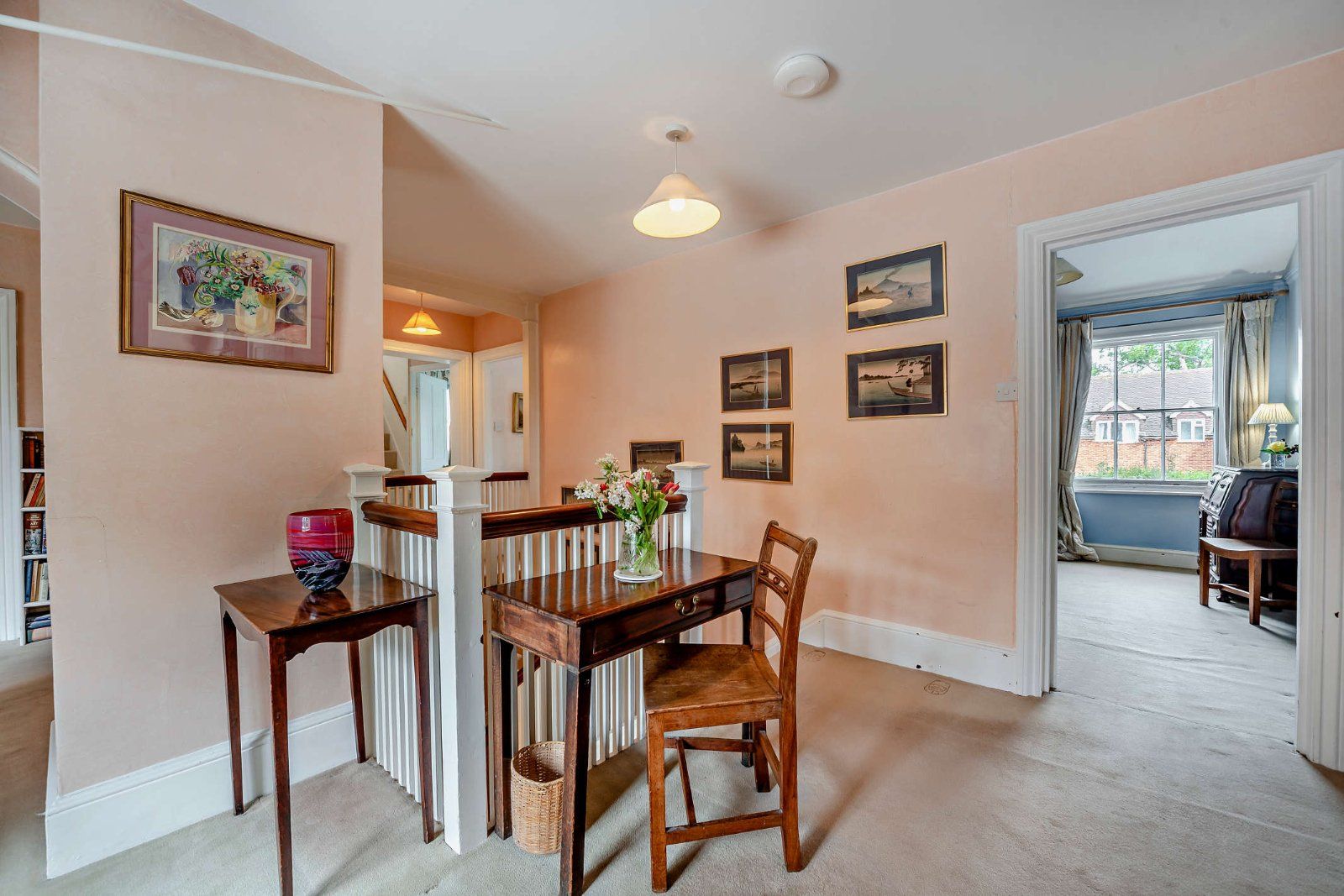 On the first floor, an open landing gives access to all five bedrooms and two bathrooms. The principal bedroom, with fitted storage, features an en suite bathroom with freestanding bath. Four further double bedrooms are served by a family bathroom with freestanding bath and separate shower.