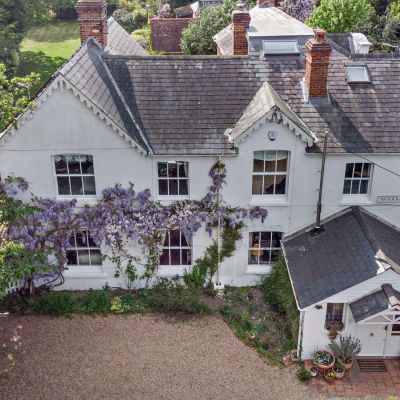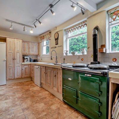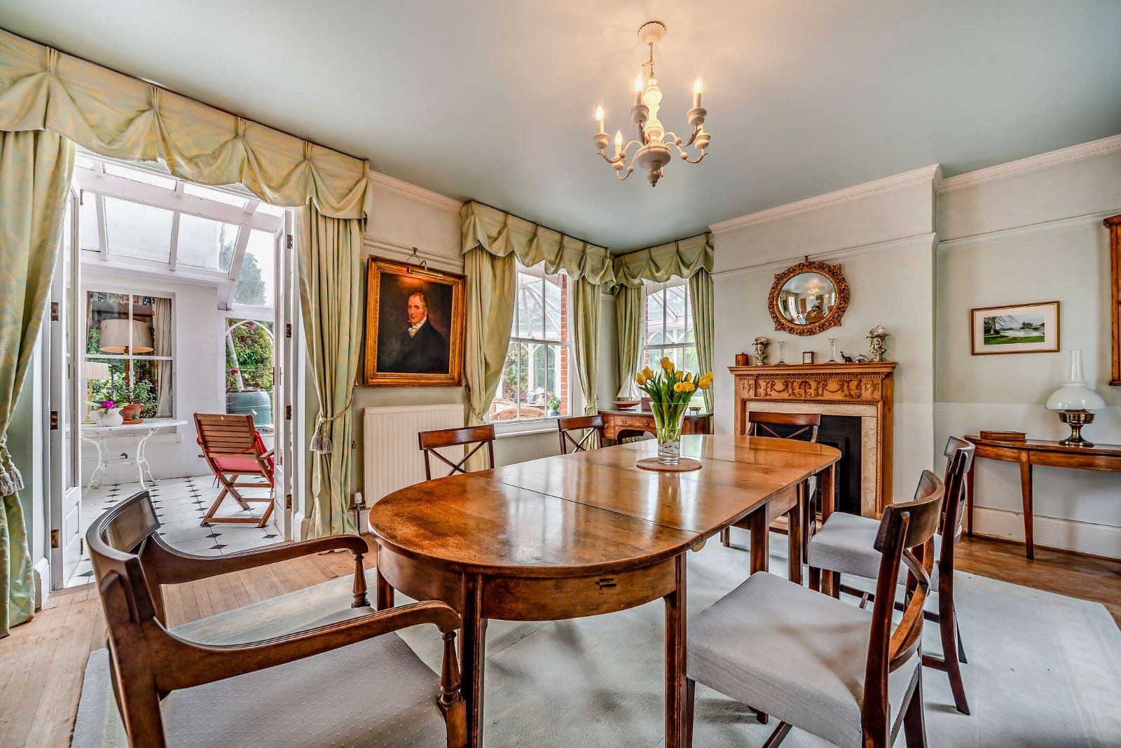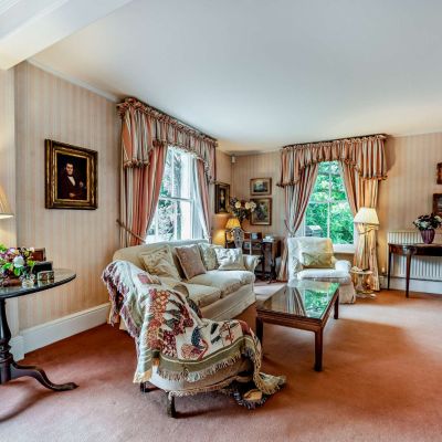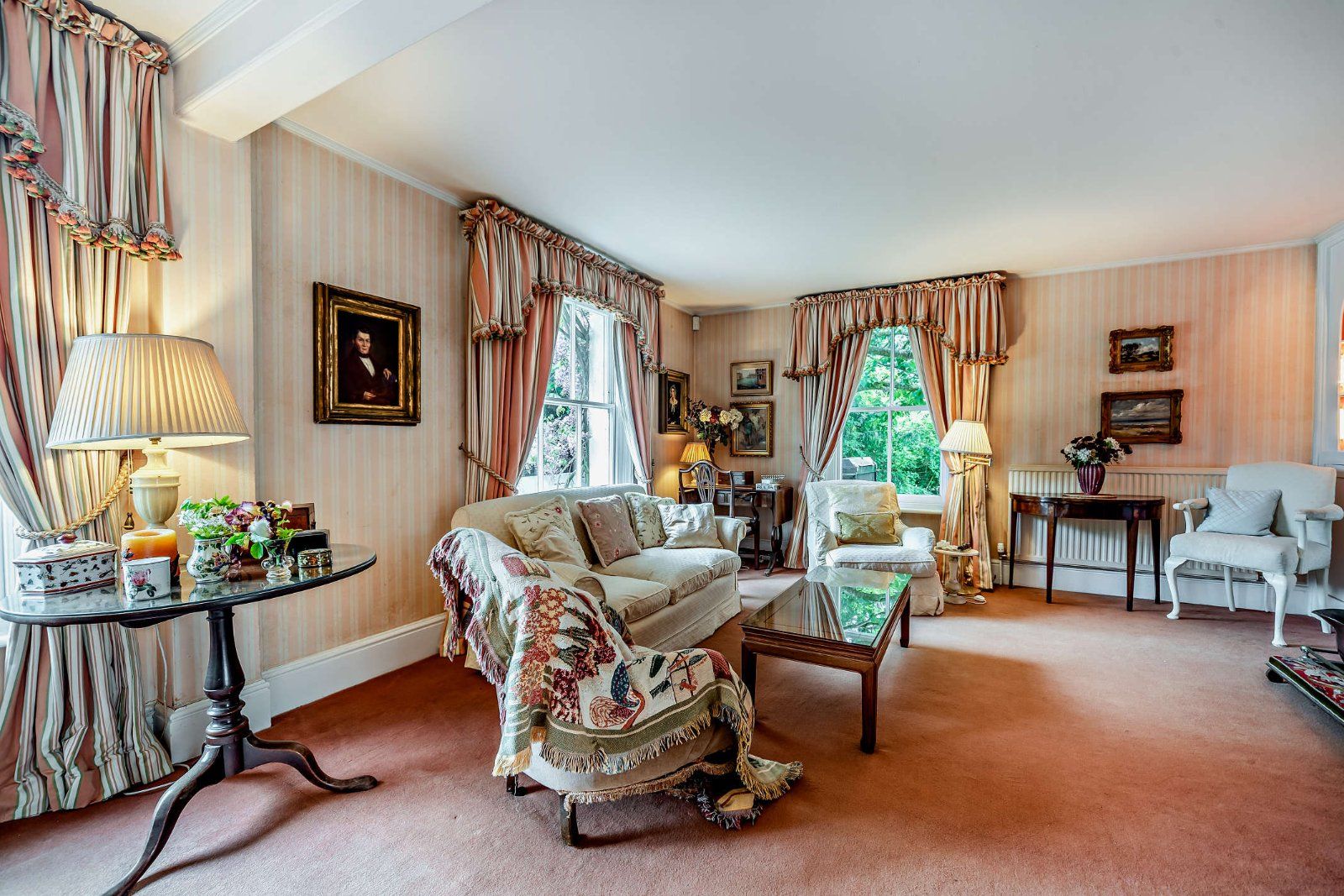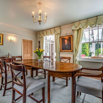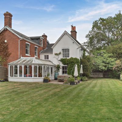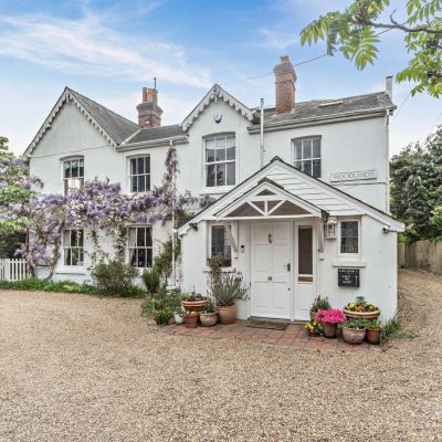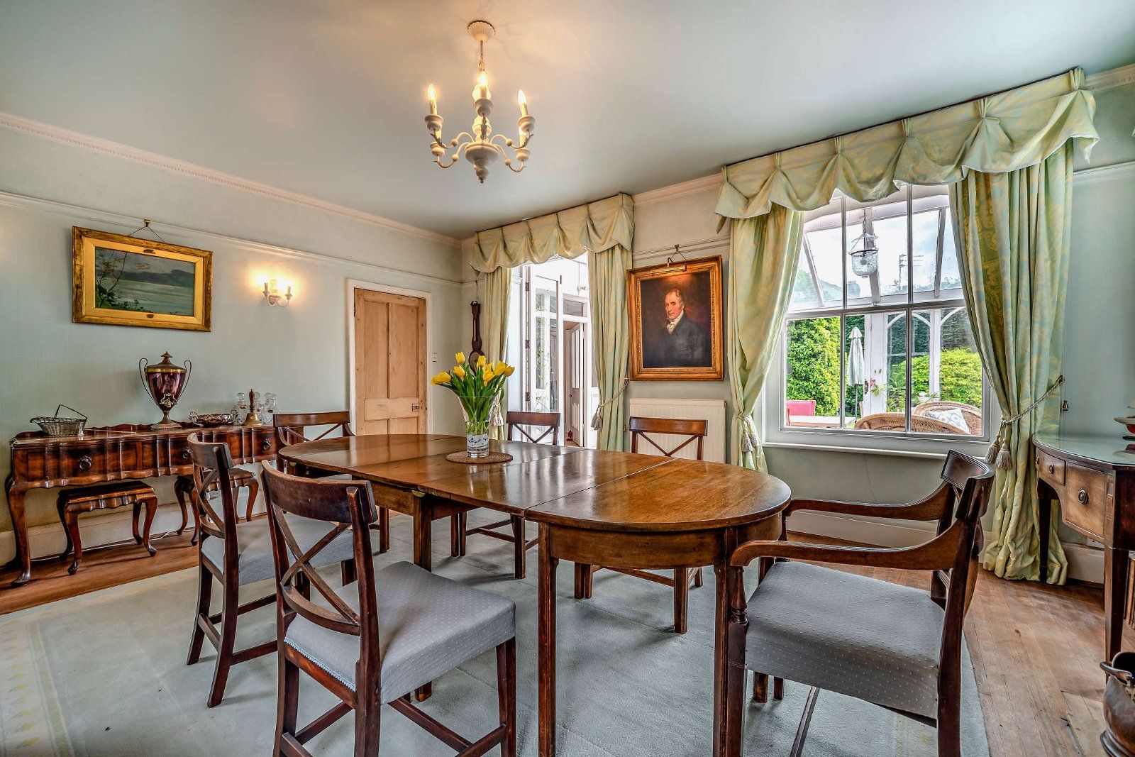 Woodlands is a handsome white-rendered doublefronted period family home offering more than 3,300 sq ft of light-filled flexible accommodation arranged over three floors. Configured to provide a practical and cohesive living and entertaining environment featuring sash glazing, high ceilings, generouslyproportioned rooms, quality fixtures and fittings and neutral décor throughout, the accommodation flows from a welcoming gable end front door, through a utility room and kitchen before arriving in the central reception hallway, also accessible by a side entrance. This hallway, with an ornate freestanding woodburner, connects to all other ground floor rooms. Each fitted with feature fireplaces, an expansive drawing room and snug TV room are accompanied by a woodenfloored dining room that connects to a large conservatory with a glazed roof and large picture glazing incorporating French doors to the rear terrace. A generous kitchen comprises a range of wall and base units, an Aga, modern integrated appliances, and space for a sizeable table.