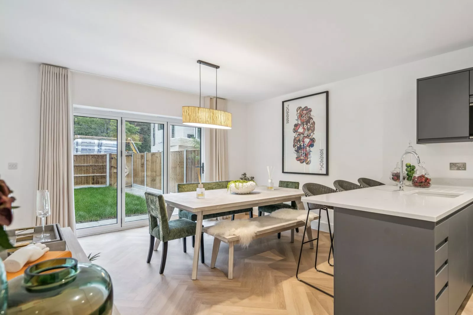SUMMARY OF ACCOMODATION • Welcoming entrance hall with a WC • Large open-plan kitchen/living/dining room • High-specification statement kitchen • Separate utility room for discreet laundry • Second reception room on the first floor • Two charming private balconies • Four spacious and airy double bedrooms • Three high-quality en-suites • Premium family bathroom • Landscaped gardens to the front and rear • Parking for at least three cars via driveway and integrated garage • EV charger