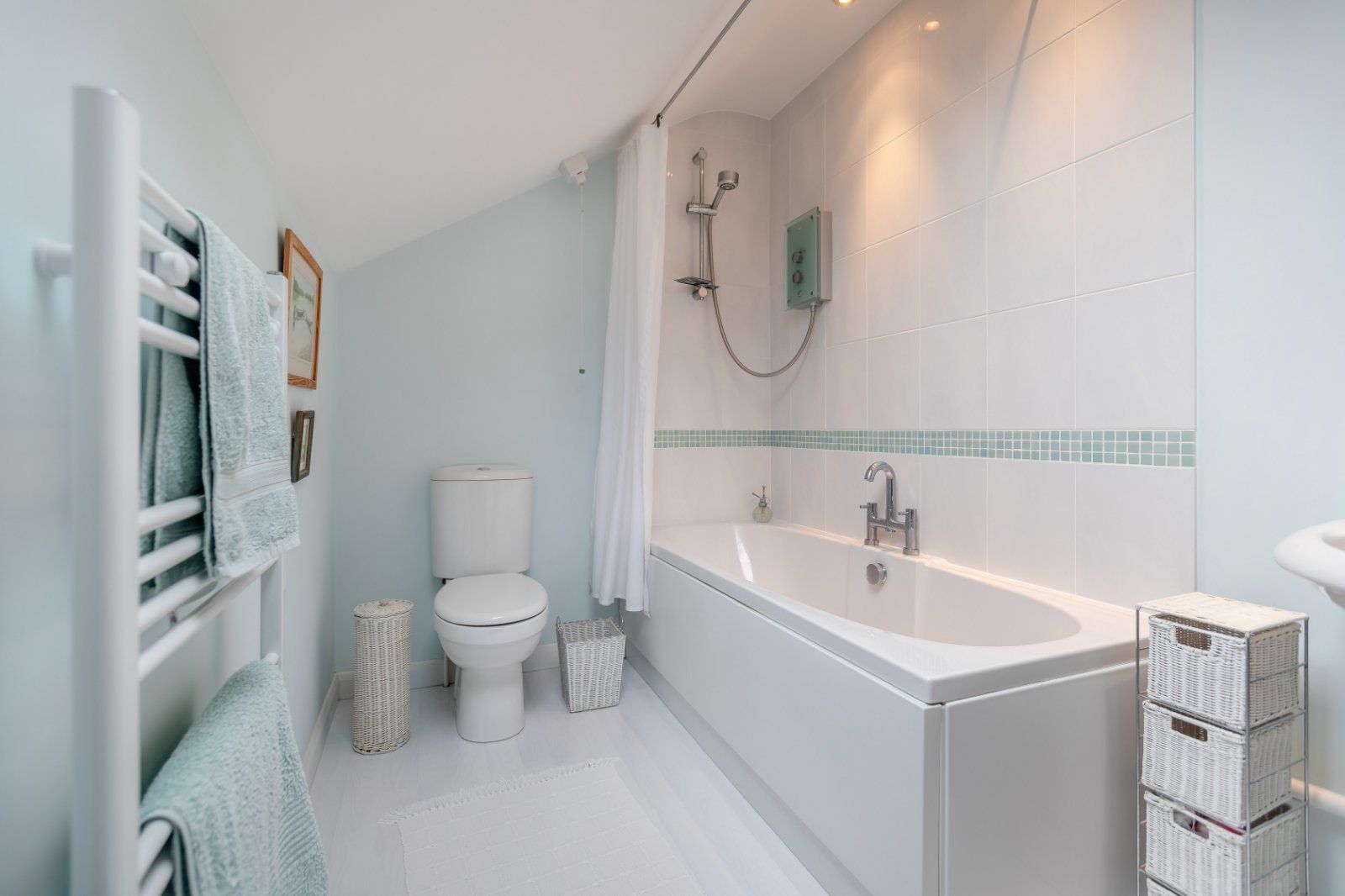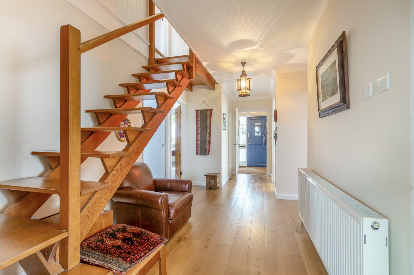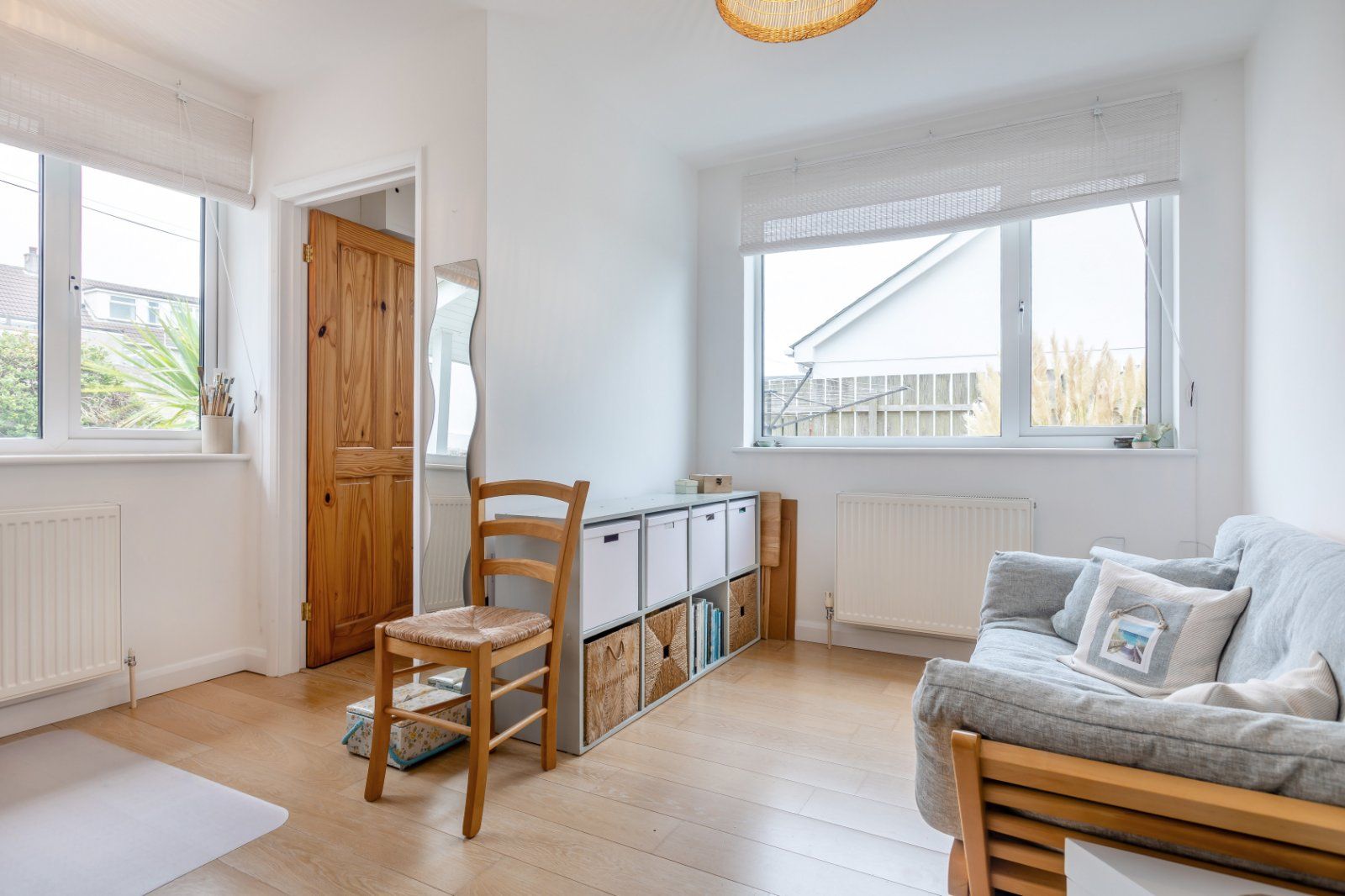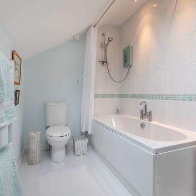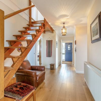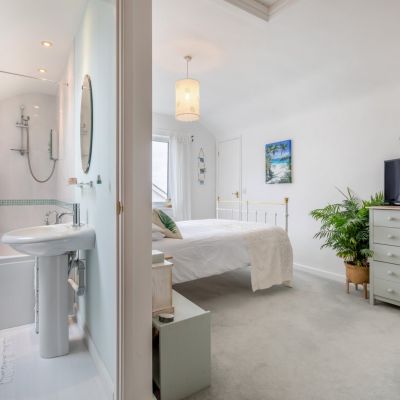 There are three double bedrooms, including one on the ground floor and two upstairs. The principal bedroom features an en suite bathroom and access to extensive eaves storage space. The second first-floor bedroom has its own washbasin. The family shower room can be found on the ground level, with its wet-room style shower and floor-to-ceiling tiling.