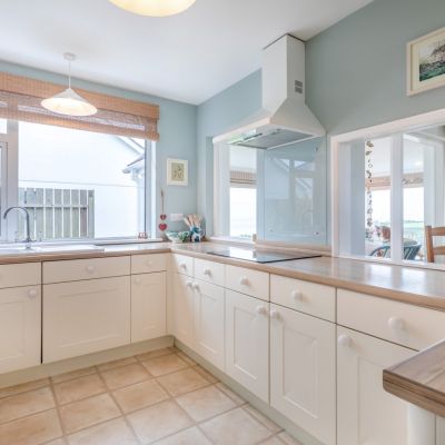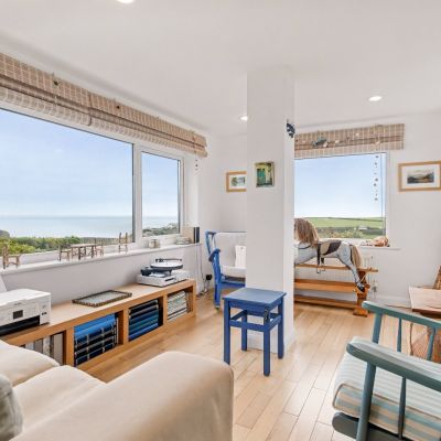 The heart of the home is the stunning 27ft sitting room, which stretches across the rear of the home offering views across the garden and far out to sea. The room provides the ideal vantage point in which to relax and enjoy the spectacular surroundings, with its brick-built fireplace lending the space a sense of warmth and comfort. Adjoining the sitting room is the sunroom, which offers equally outstanding views, as well as a door to the rear garden. There is also a well-equipped kitchen with plenty of storage in fitted units, as well as integrated appliances, including a double oven, an induction hob and an extractor hood. Towards the front of the ground level there is a formal dining room and a study, either of which could be used as additional bedrooms if required.