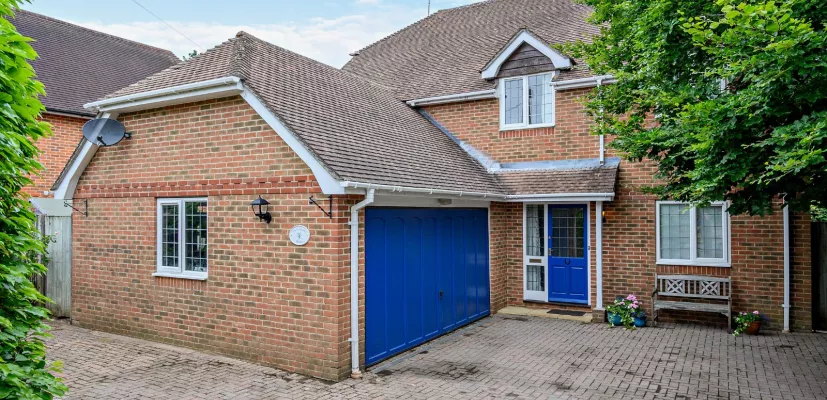 The rear garden is a generous size and laid mostly to lawn with some specimen trees, a paved terrace and backs onto a strip of woodland providing great privacy. A further west facing, paved terrace area exits down one side of the house where there’s a garden shed. To the front is a block-paved driveway with manual timber gate and separate pedestrian gate providing access to the attached double garage which also has internal access from the downstairs hallway.