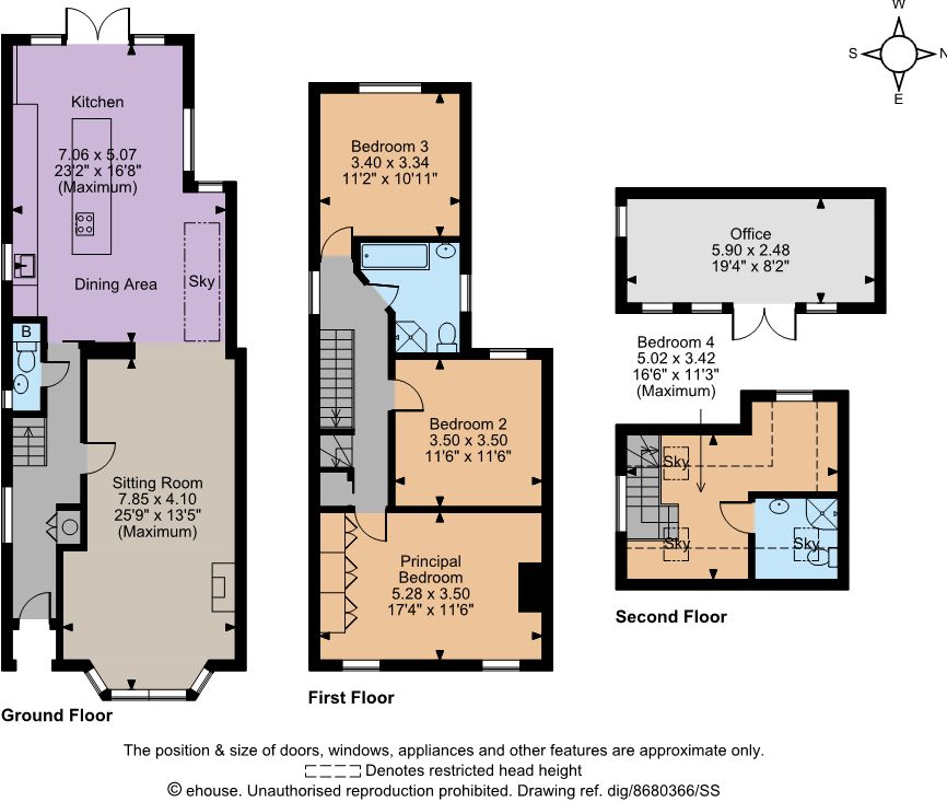 On the first floor there are three well-presented double bedrooms, including the principal bedroom with its wooden flooring, two sash windows to the front and extensive built-in wardrobes. The first floor also has a family bathroom with floor-to-ceiling tiling, a bathtub, a pedestal washbasin with storage underneath and a separate shower unit. Stairs continue from the first-floor landing to the second floor, where there is a fourth double bedroom with two skylights and an en suite shower room, fitted with a rainfall shower.