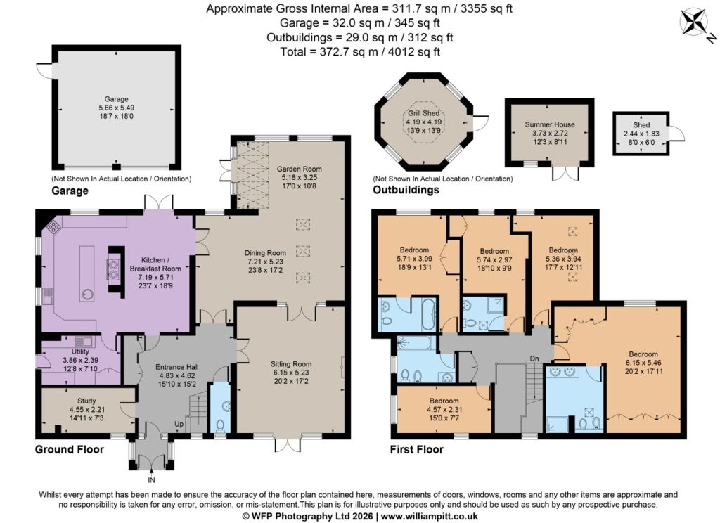 The property is accessed via a private driveway with two linked access points, plenty of off street parking and an associated double garage. To the rear of the property is a generous lawned garden with shrub and hedge borders, spacious patio seating area, summer house and grill shed.