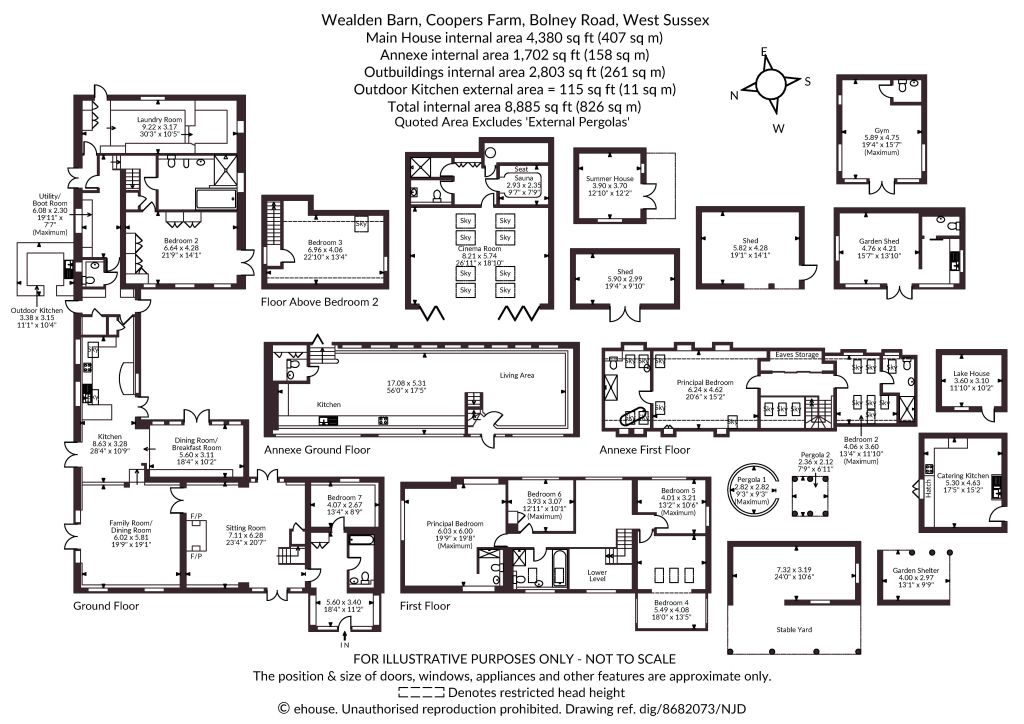 Outside, the grounds include various impressive outbuildings with additional leisure facilities. These include the cinema room and sauna (with shower facilities), the home gym and the catering kitchen, as well as stores, sheds, stables, a summer house, a lake house and two pergolas. The gardens feature patio areas and a large sheltered barbecue and dining area, an outdoor swimming pool and well-maintained lawns, with grassy paddocks beyond. A pathway leads to the pictureseque lake with timber jetty.