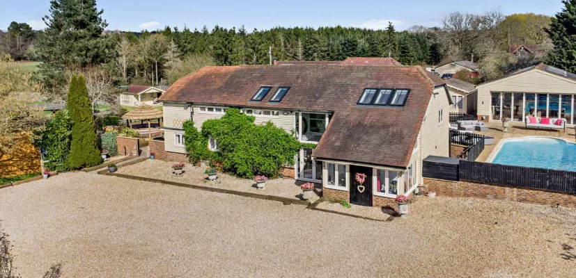 Wealden Barn is a sprawling, luxury detached home with a substantial main house and various splendid outbuildings, set in a peaceful and picturesque rural position, just outside the village of Cowfold on the edge of the High Weald National Landscape.