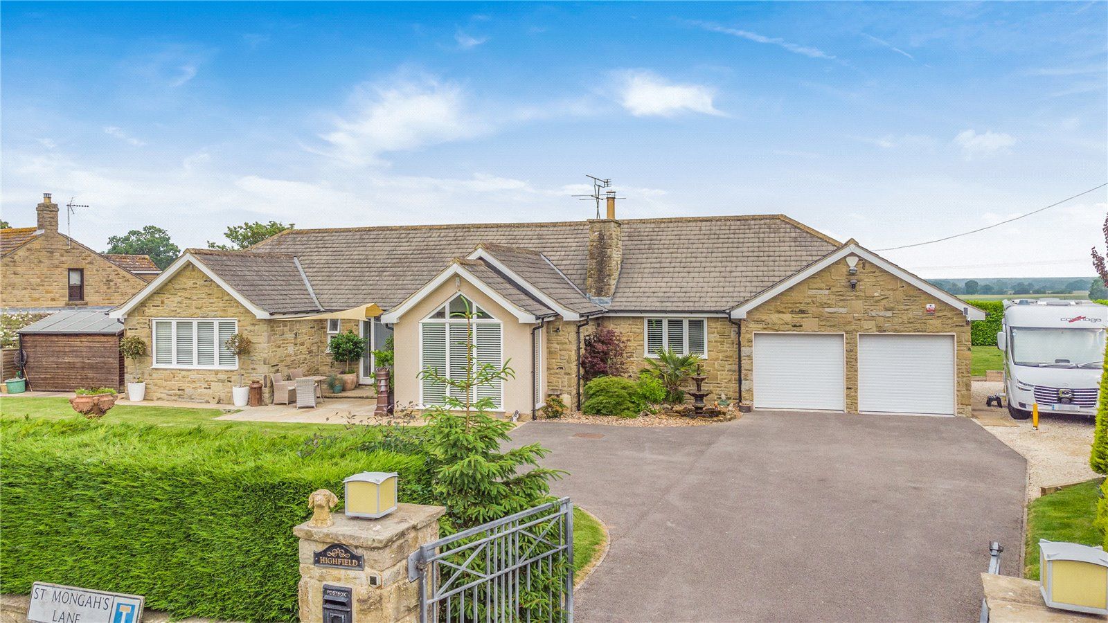 The property Highfield is a splendid part stone-clad family home offering a total of 2,694 sq. ft of light-filled flexible accommodation arranged over a single floor and with the benefit of planning permission for the addition of two bedrooms and two bathrooms on a first-floor extension.